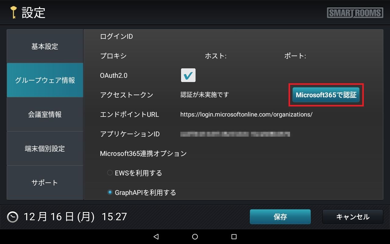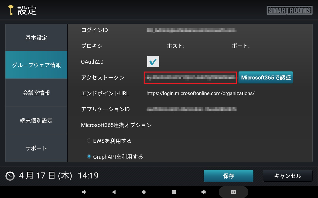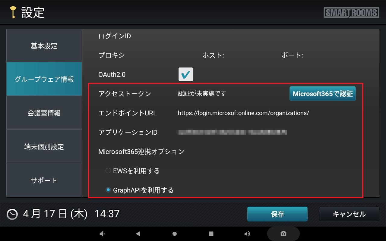 → OAuth2.0に関する情報が追加表示されます。・ アクセストークン(この時点では空白)・[Microsoft365で認証]ボタン・ エンドポイントURL・ アプリケーションID(画面下にスクロールすると表示されます)・ Microsoft365連携オプション〇 EWSを利用する〇 GraphAPIを利用する注釈