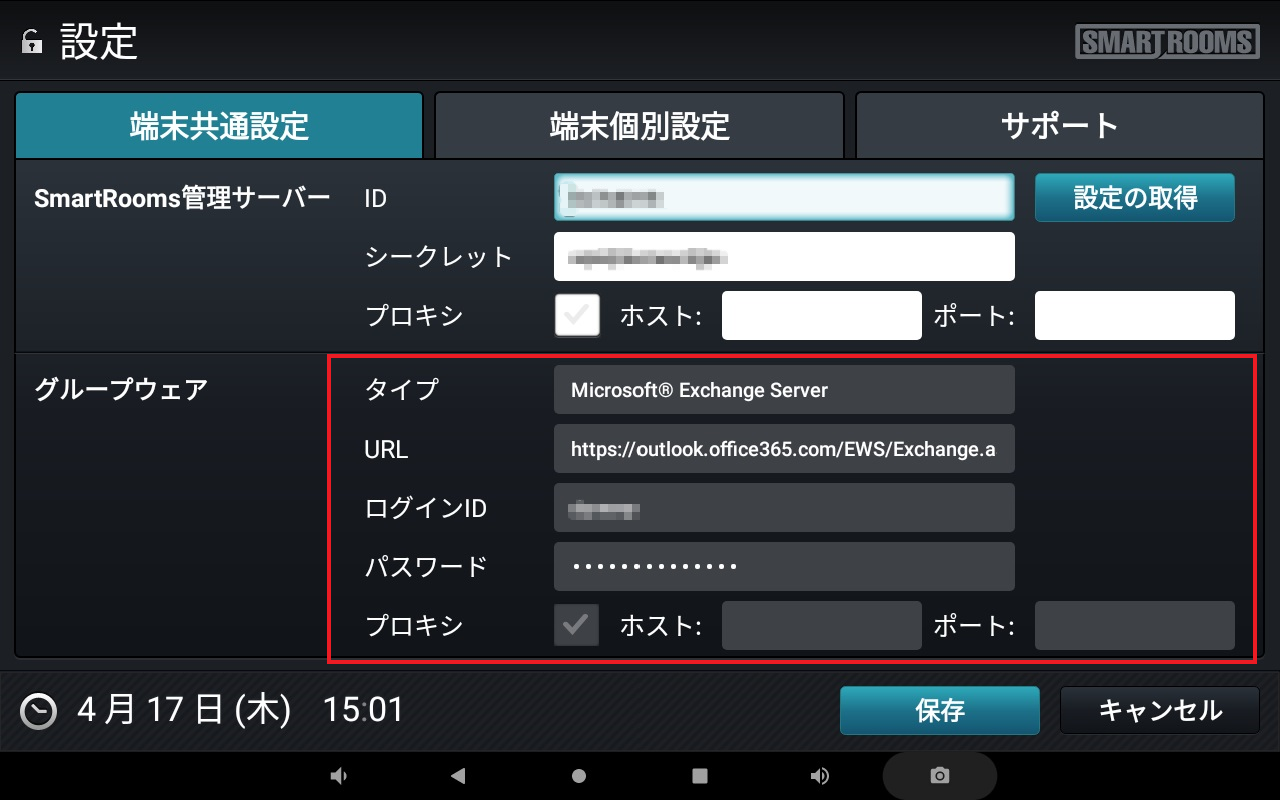 会議室名が「第一会議室」の場合は、「第一」と入力します。会議室のリソースIDが smartrooms@example.com の場合は smartと入力します。smartと付くリソースIDが多く存在する場合は、smartroomsまで入力します。c). [会議室の取得]をタップします。