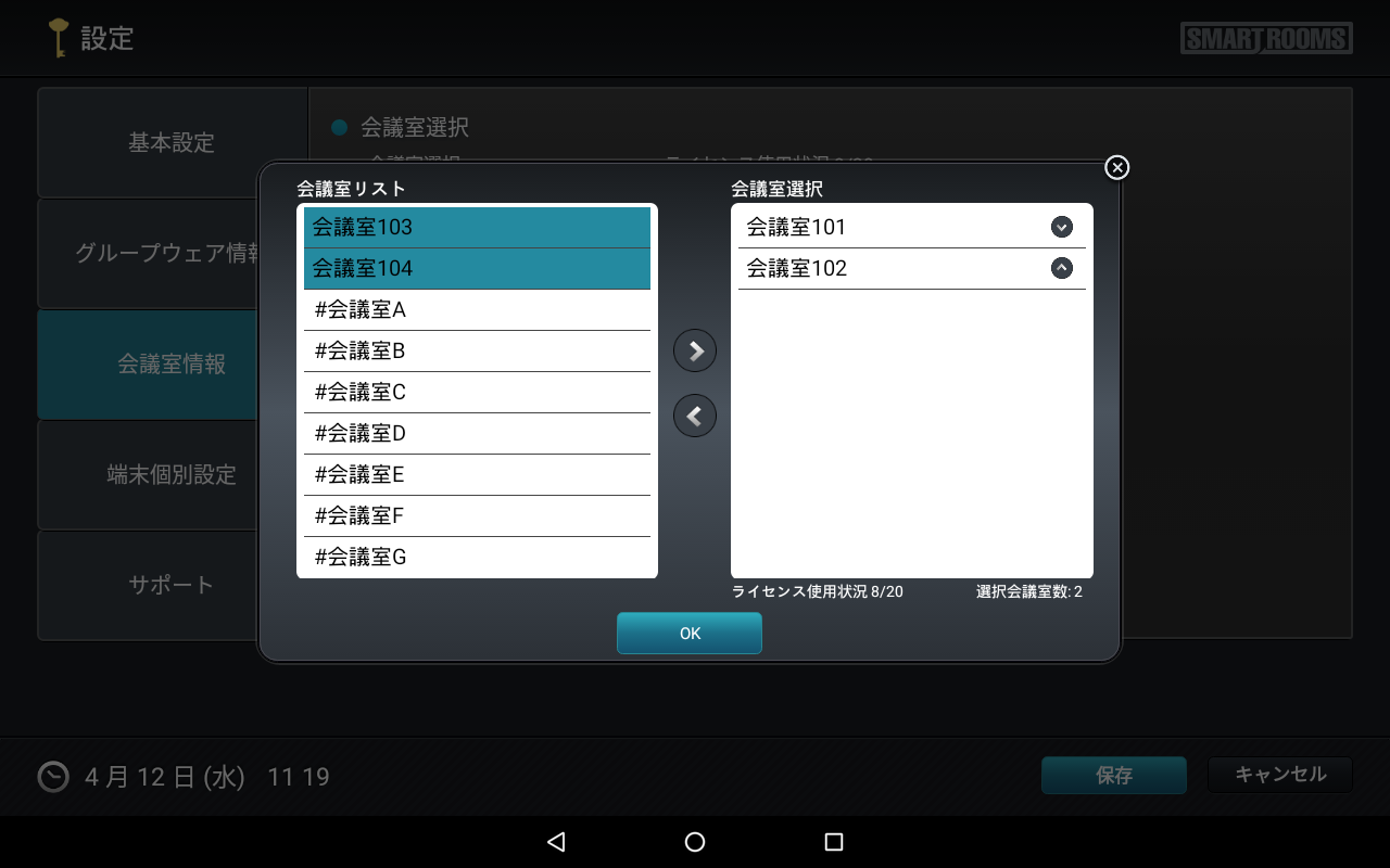 - d). 集中端末に割り当てる会議室を右のリスト(会議室選択)に移動します。