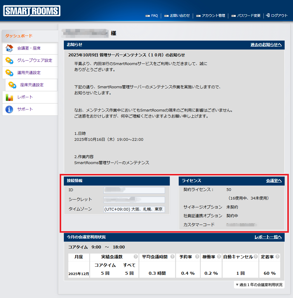 管理者用ウェブサイトごとに発行されるSmartRoomsの契約ID