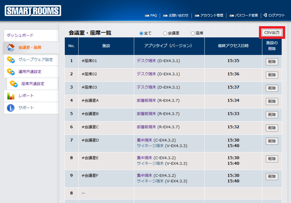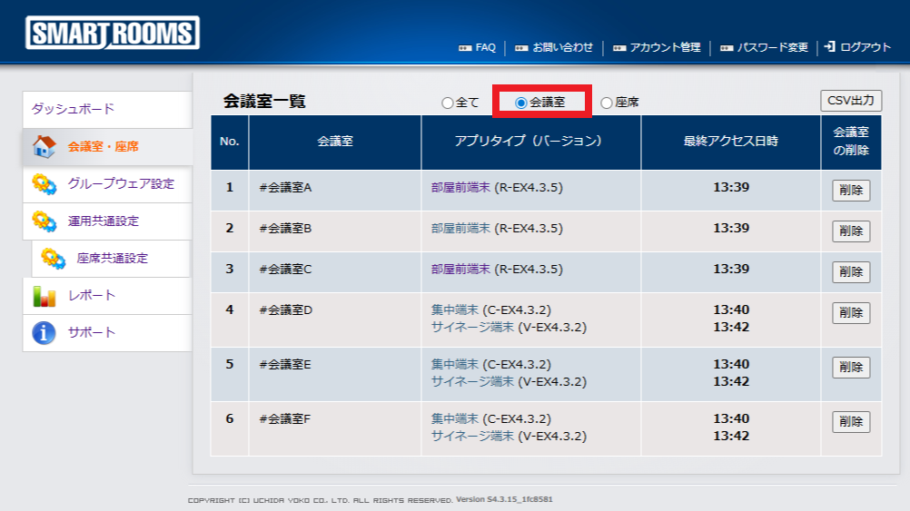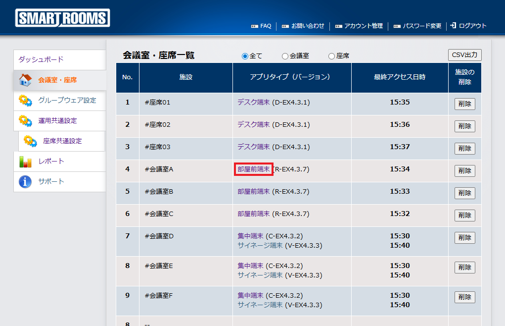 管理者用ウェブサイトから、不要になった会議室情報や座席情報、もしくは端末情報(変更前の端末情報)があれば削除します。