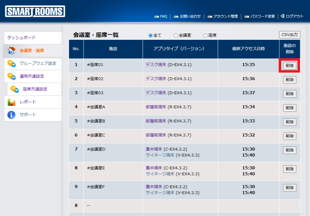 管理者用ウェブサイトの会議室・座席一覧から、管理画面でアプリをアンインストールした端末に紐づく会議室や座席を削除します。