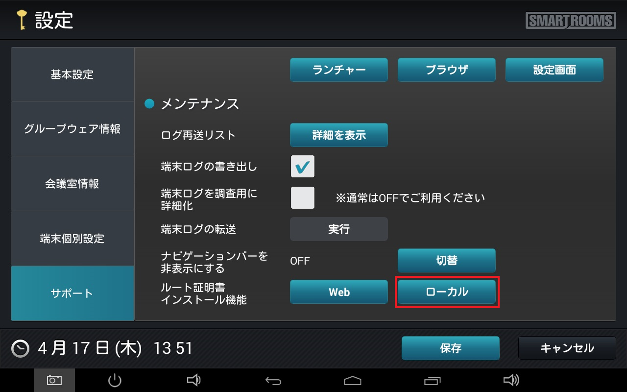 「ルート証明書インストール機能」の[ローカル]をタップします。