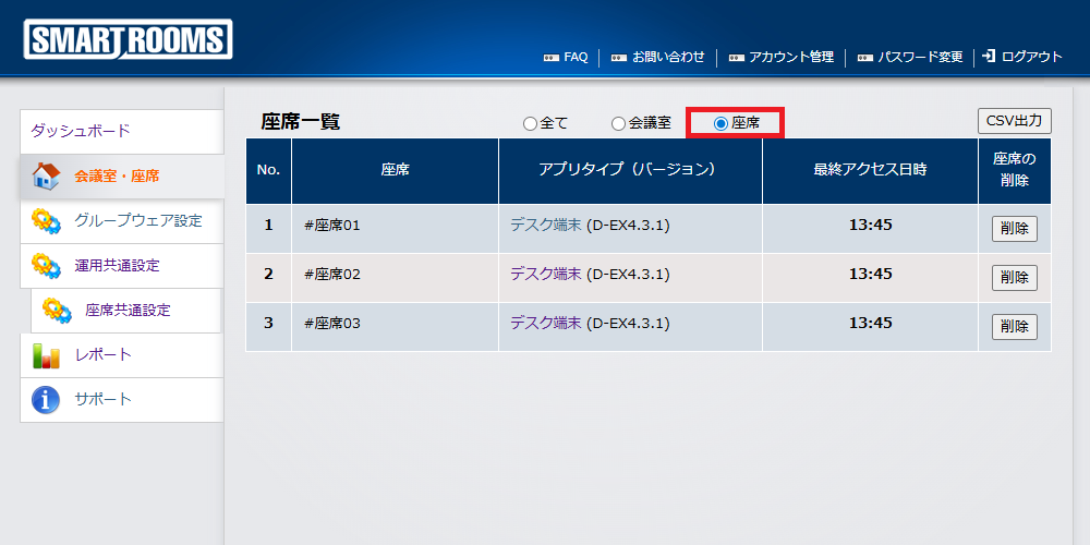 管理者用ウェブサイトから会議室や座席が削除されると、その会議室や座席が割り当てられていた端末情報にはアクセスできなくなり、レポート機能の各種グラフにも対象の会議室や座席は表示されなくなります。契約ライセンスの変更は、サービス申込書が必要です。担当営業に連絡してください。