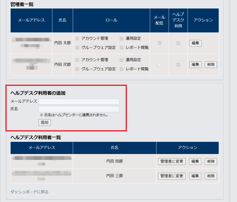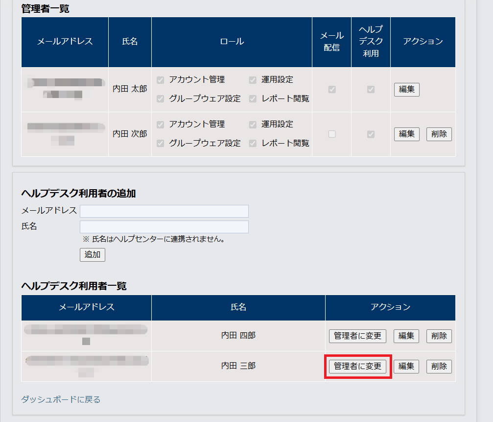 管理者とヘルプデスク利用者は、同じメールアドレスでアカウント登録を行うことができません。ヘルプデスク利用者を管理者に変更したい場合は、「ヘルプデスク利用者から管理者への変更」を参照してください。管理者からヘルプデスク利用者への変更はできません。注釈