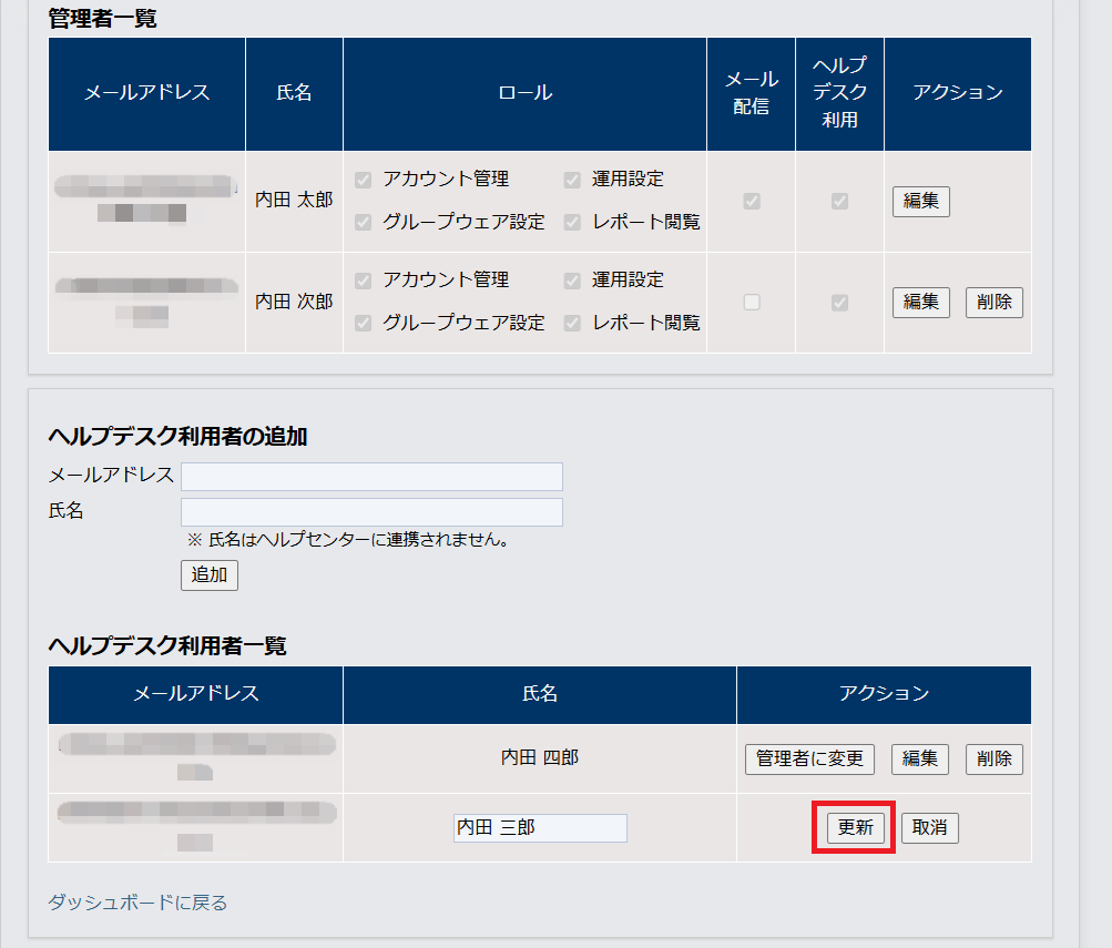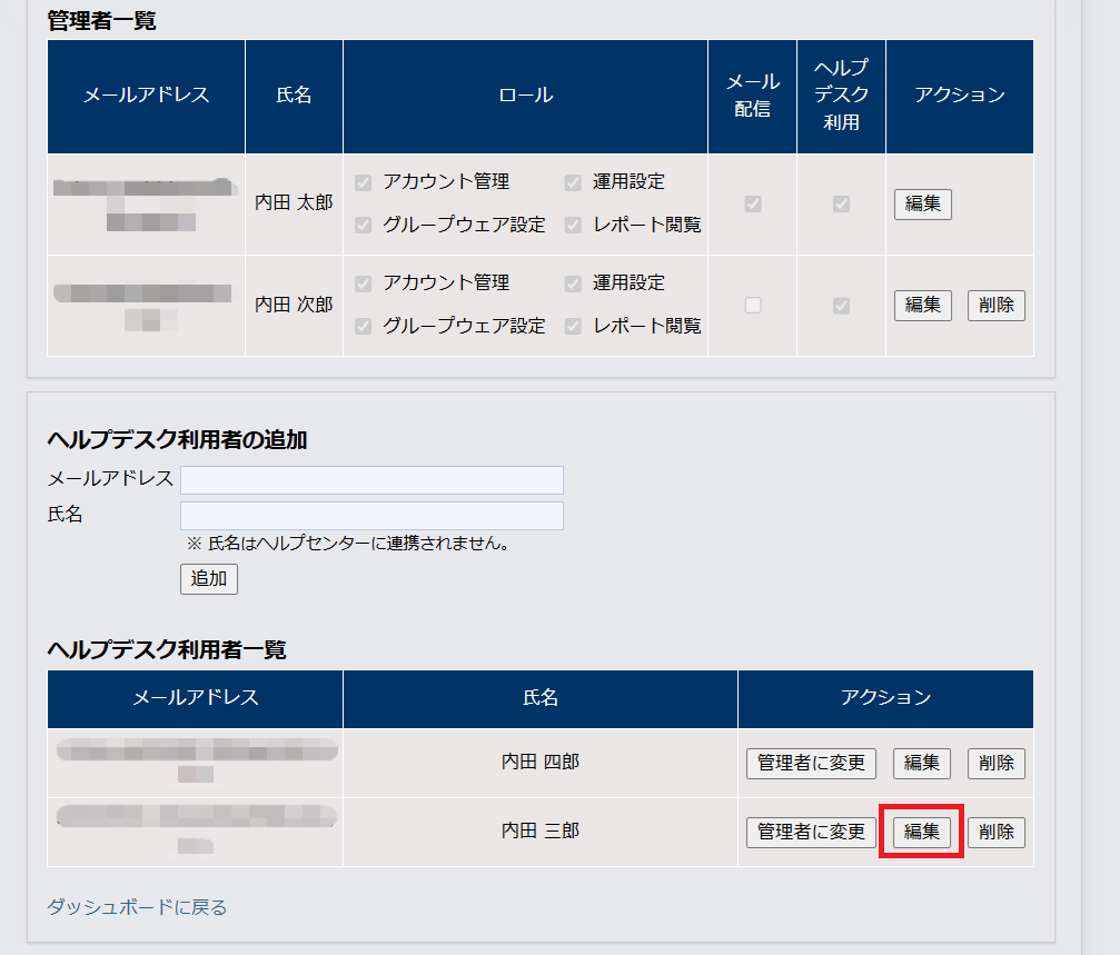 氏名欄、ロールとメール配信、ヘルプデスク利用のチェックボックスが編集可能になるので、適宜変更します。