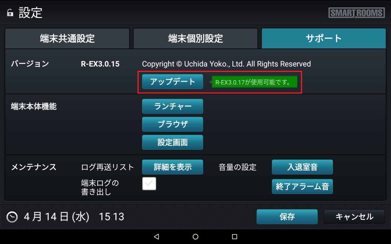 SmartRoomsアプリを初期化した場合、契約IDとシークレットの入力、会議室の設定、および入退室音・各種アラーム音などの「端末個別設定」の再設定が必要です。