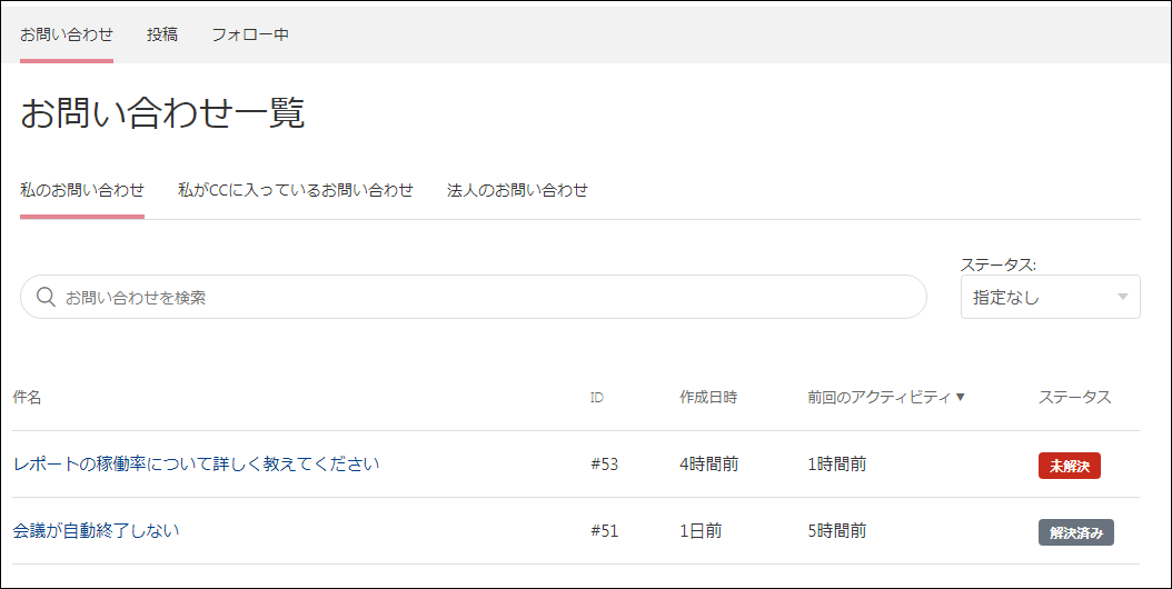 SmartRoomsヘルプセンターのお問い合わせ一覧は、現在進行中のお問い合わせや、過去のお問い合わせ、同じ法人の別の方からのお問い合わせを確認する機能もあります。
