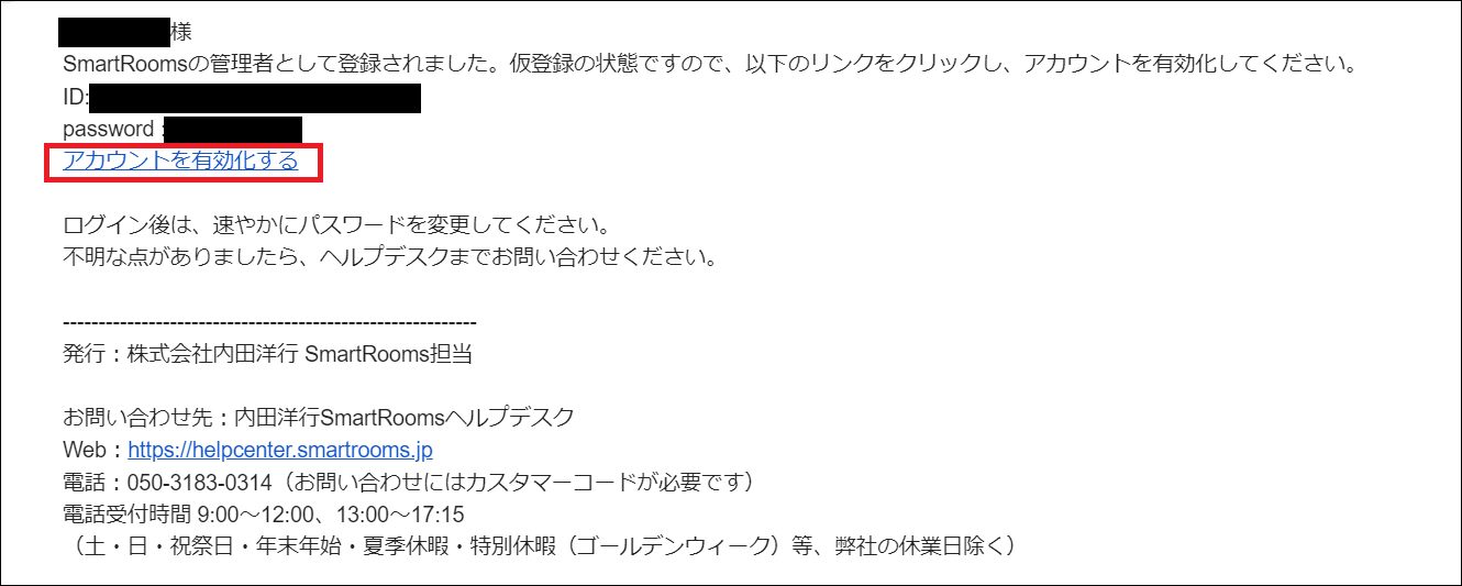 「SmartRoomsヘルプセンターのアカウントをアクティブにしてください」のメールが届いたら、本文のURLをクリックします。