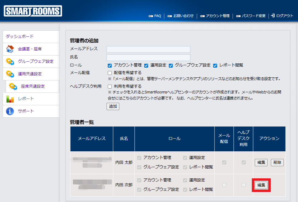 管理者一覧で該当管理者のアクションにある[編集]をクリックします。