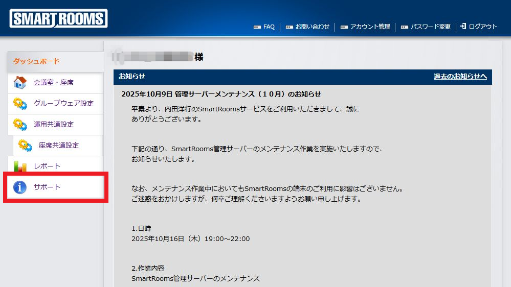 SmartRoomsのアカウント管理、各種お問い合わせなどについて説明します。