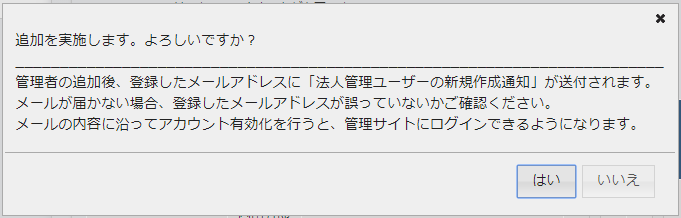 確認ダイアログが表示されるので、[はい]をクリックすると管理ユーザーが追加されます。