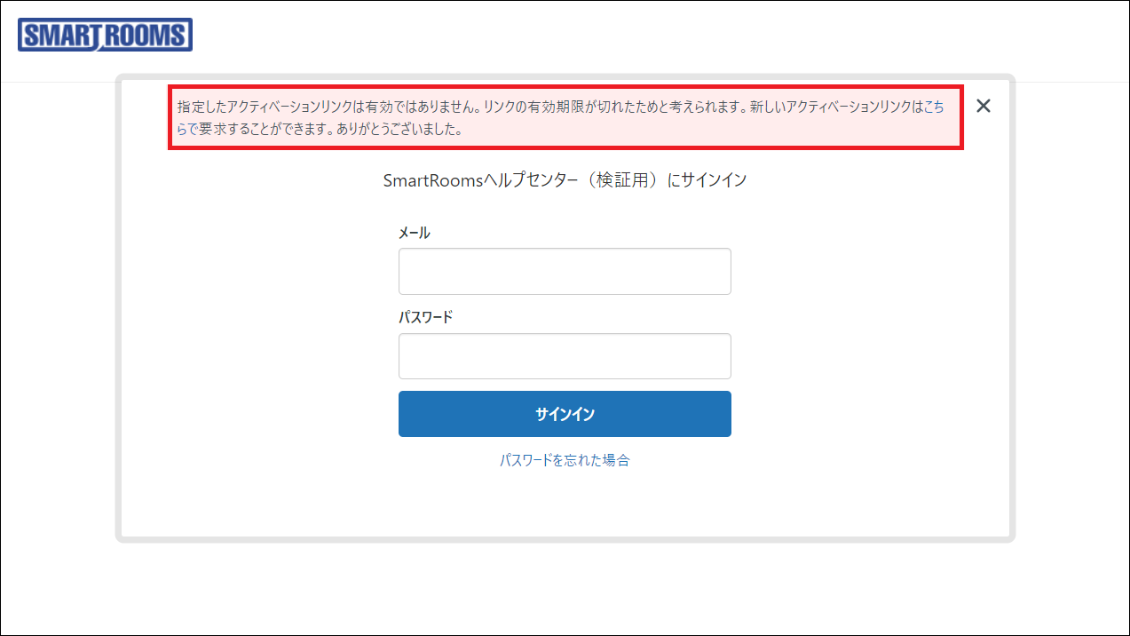 - URLの有効期間は24時間です。有効期間を過ぎたURLをクリックすると、「指定したアクティベーションリンクは有効ではありません」と表示されます。表示されたメッセージに従い「こちら」をクリックしてURLを再発行し、パスワードを設定します。