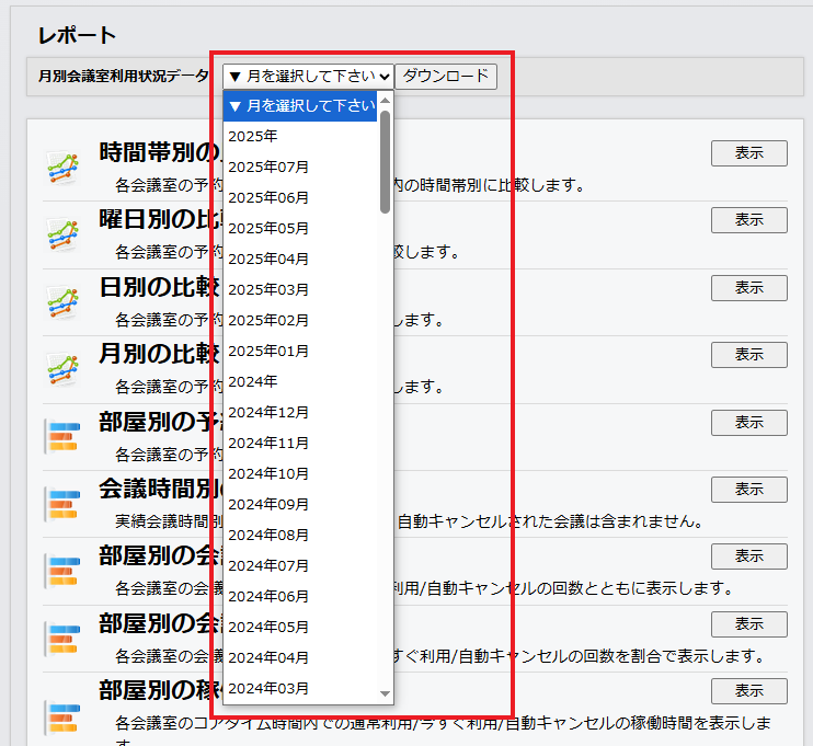 月別の会議室利用状況データのダウンロード方法について説明します。