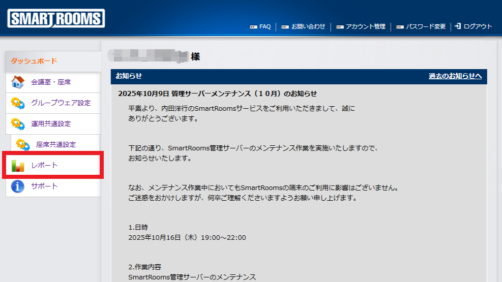 ログイン方法については、「 通常のログイン 」を参照してください。→ ダッシュボード画面が表示されます。「 レポート 」タブをクリックします。