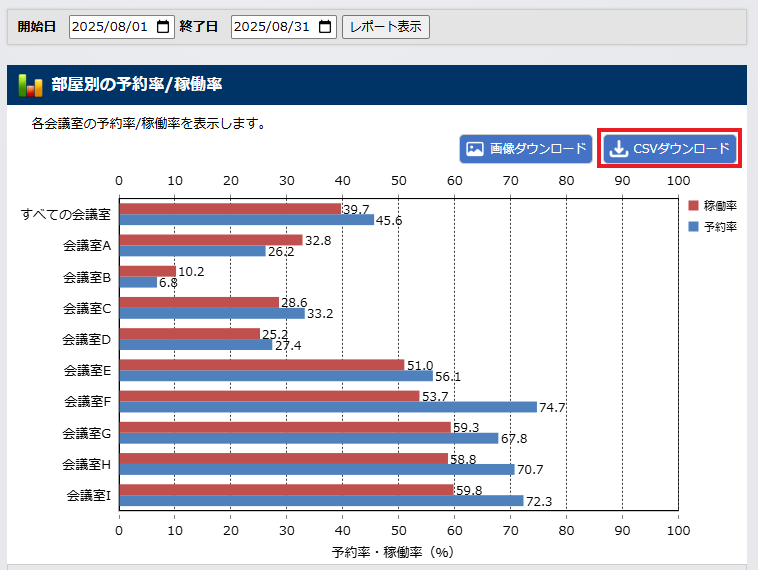 各会議室の予約率/稼働率を表示します。
