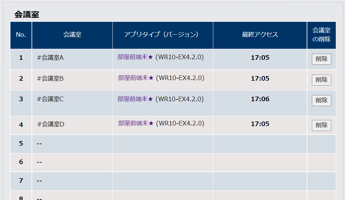 - →現在使用中の会議室・座席一覧が表示されます。「アプリタイプ(バージョン)」の列で、その会議室で使用している端末のアプリバージョンが確認できます。