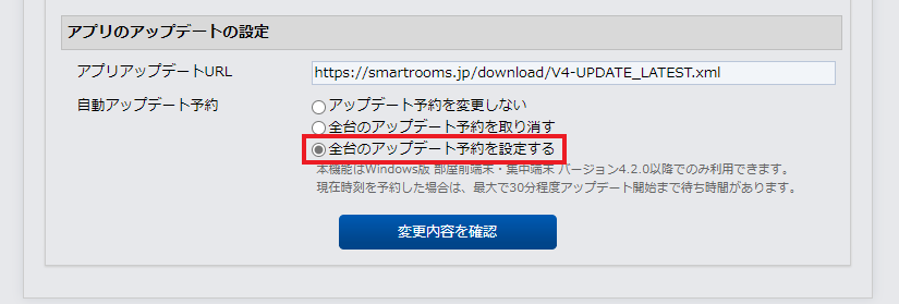 - 一番下の「アプリのアップデートの設定」で自動アップデート予約の「全台のアップデート予約を設定する」のラジオボタンをオンにします。