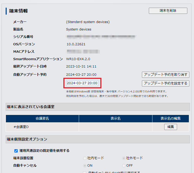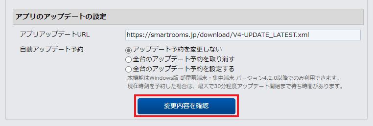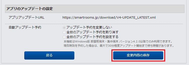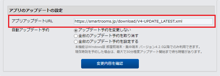 - あらかじめ日時を指定することで、端末のアプリに自動的にアップデートをさせる日時の予約ができます。この機能を使用するには、管理者用ウェブサイトの運用共通設定で「アップデートURL」を設定します。使用中の自動アップデート予約が可能な端末全台を対象にアップデートする場合、「運用共通設定」でアップデート日時の予約を行います。特定の端末のみで自動アップデート予約を行いたい場合は、会議室・座席一覧の「アプリタイプ(バージョン)」をクリックして、端末情報の自動アップデート予約で設定します。アップデート後は「アップデートURL」で指定されたアプリのバージョンになります。
