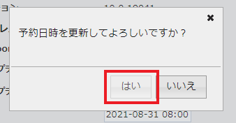 「予約日時を更新してよろしいですか?」というダイアログが表示されるので、[はい]をクリックします。