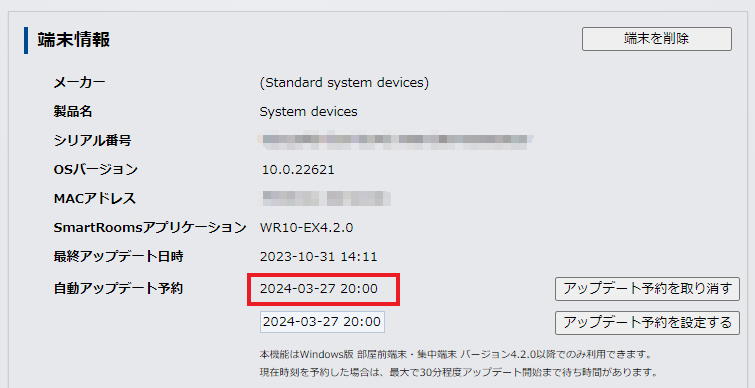 自動アップデート予約に入力した日時が設定されていることを確認します。