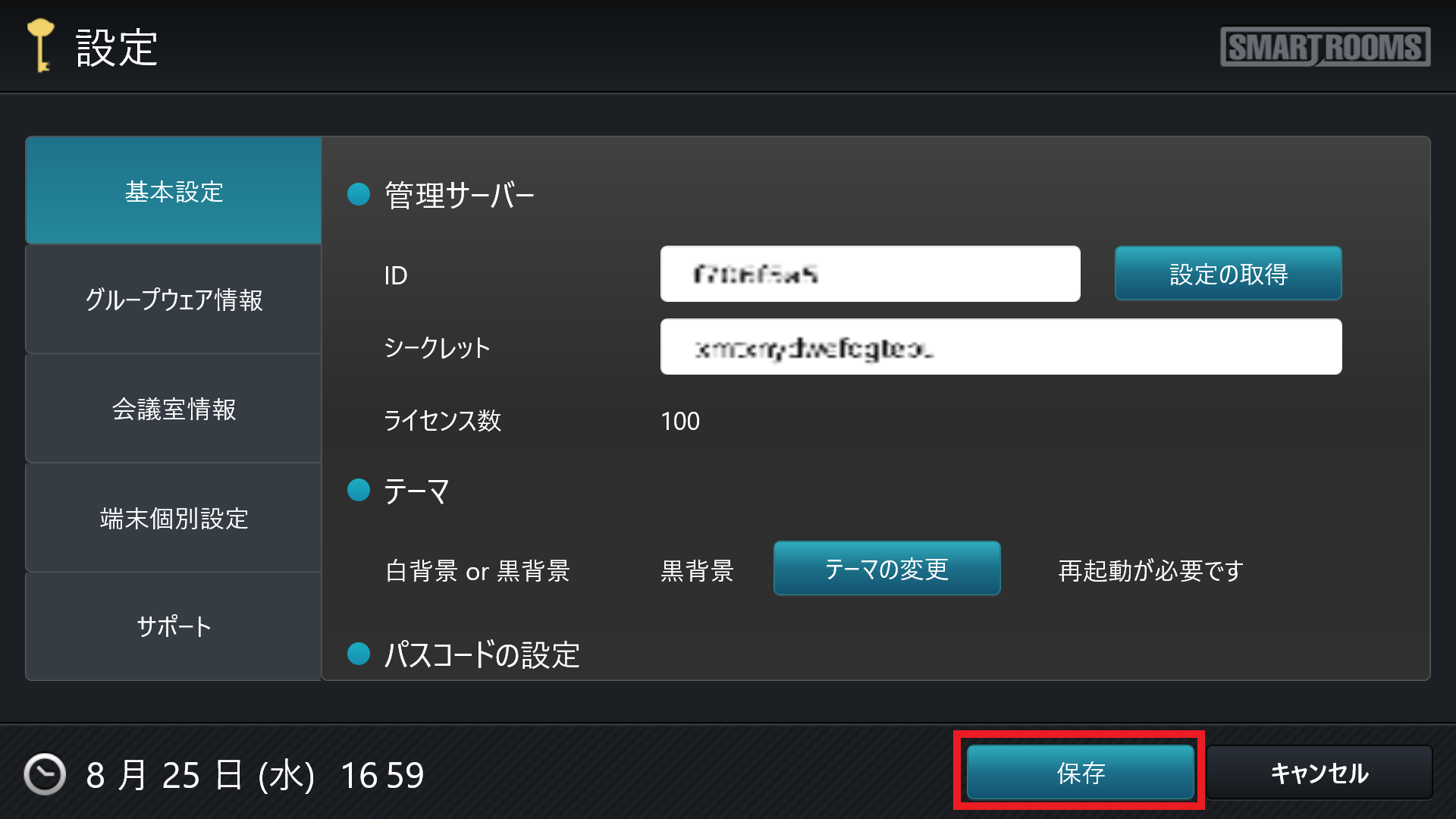 設定された内容は、30分に1回の定期アクセスで端末に取得されて反映されます。即時に反映させる場合は、SmartRoomsアプリの設定画面で 「 設定の取得 」ボタンをタップして設定を保存してください。設定画面の表示は、「 設定画面への移動 」を参照してください。