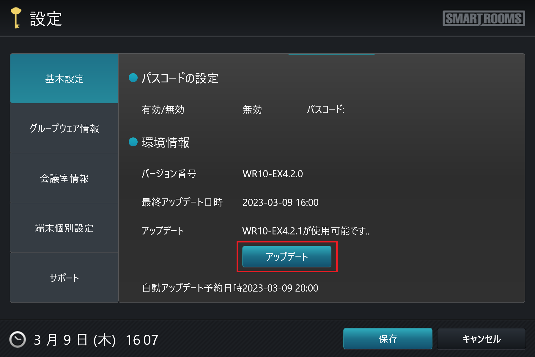 「 基本情報 」タブで、 「環境情報」の[アップデート]ボタンが有効になっていることを確認しタップします。