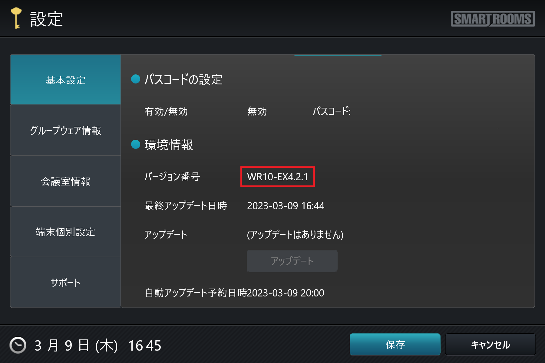 「基本設定」タブで一番下にスクロールし「環境情報」の「バージョン番号」を確認します。