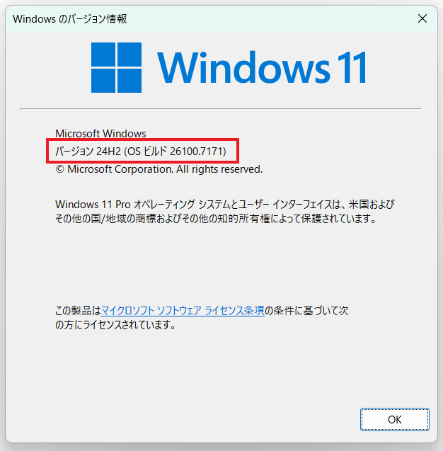 「Windowsのバージョン情報」が表示されるので、バージョンとビルド番号を確認します。