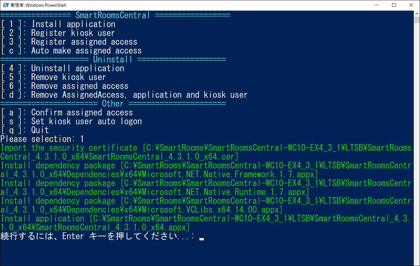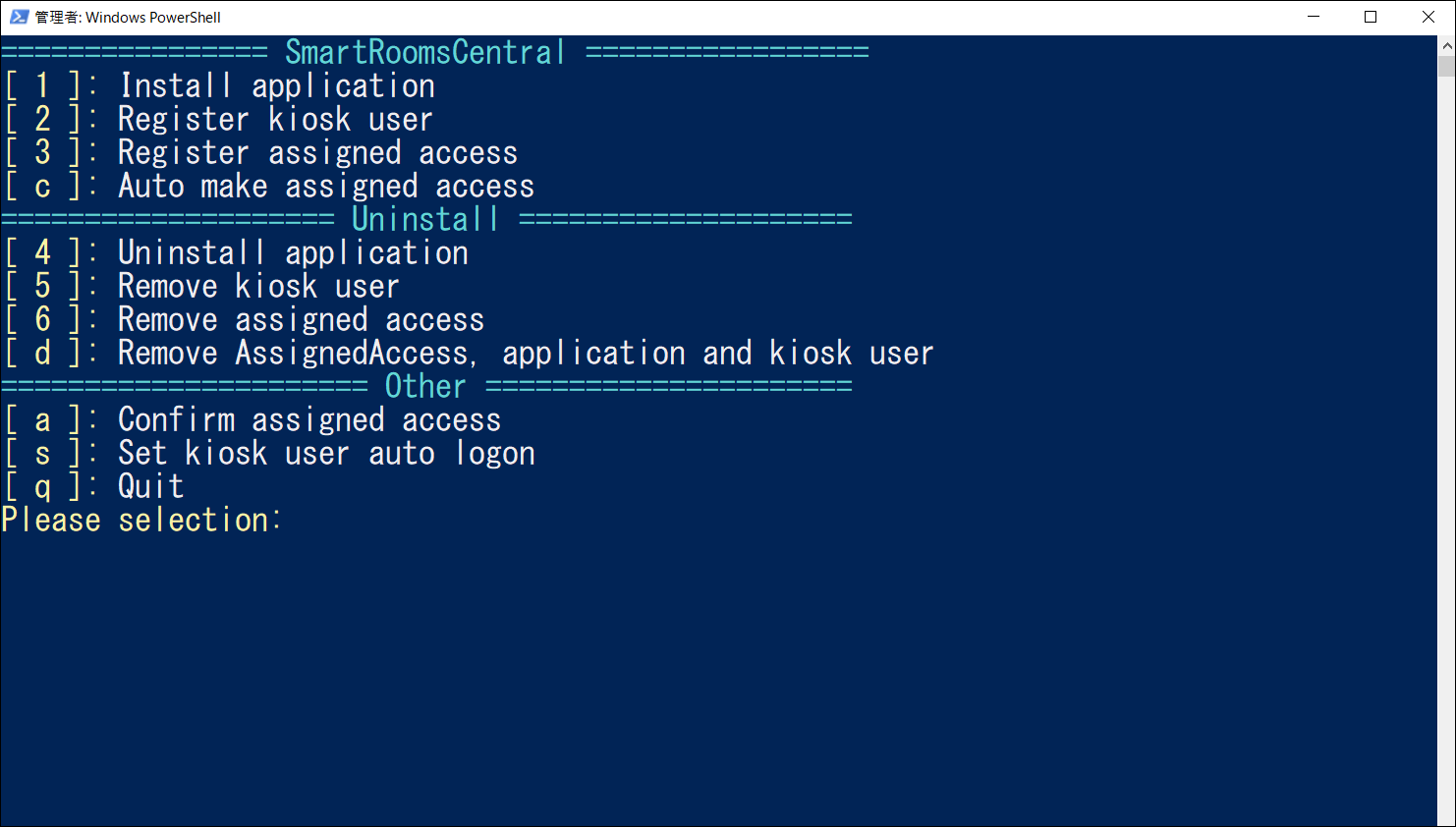 PowerShellを実行したユーザーアカウントが管理者でない場合は、管理者のIDとパスワードを求められるので入力します。以下のメニューが表示されます。