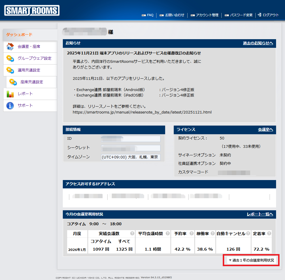 - 管理者用ウェブサイトごとに発行されるSmartRoomsの契約IDです。本マニュアルでは契約IDと表記します。