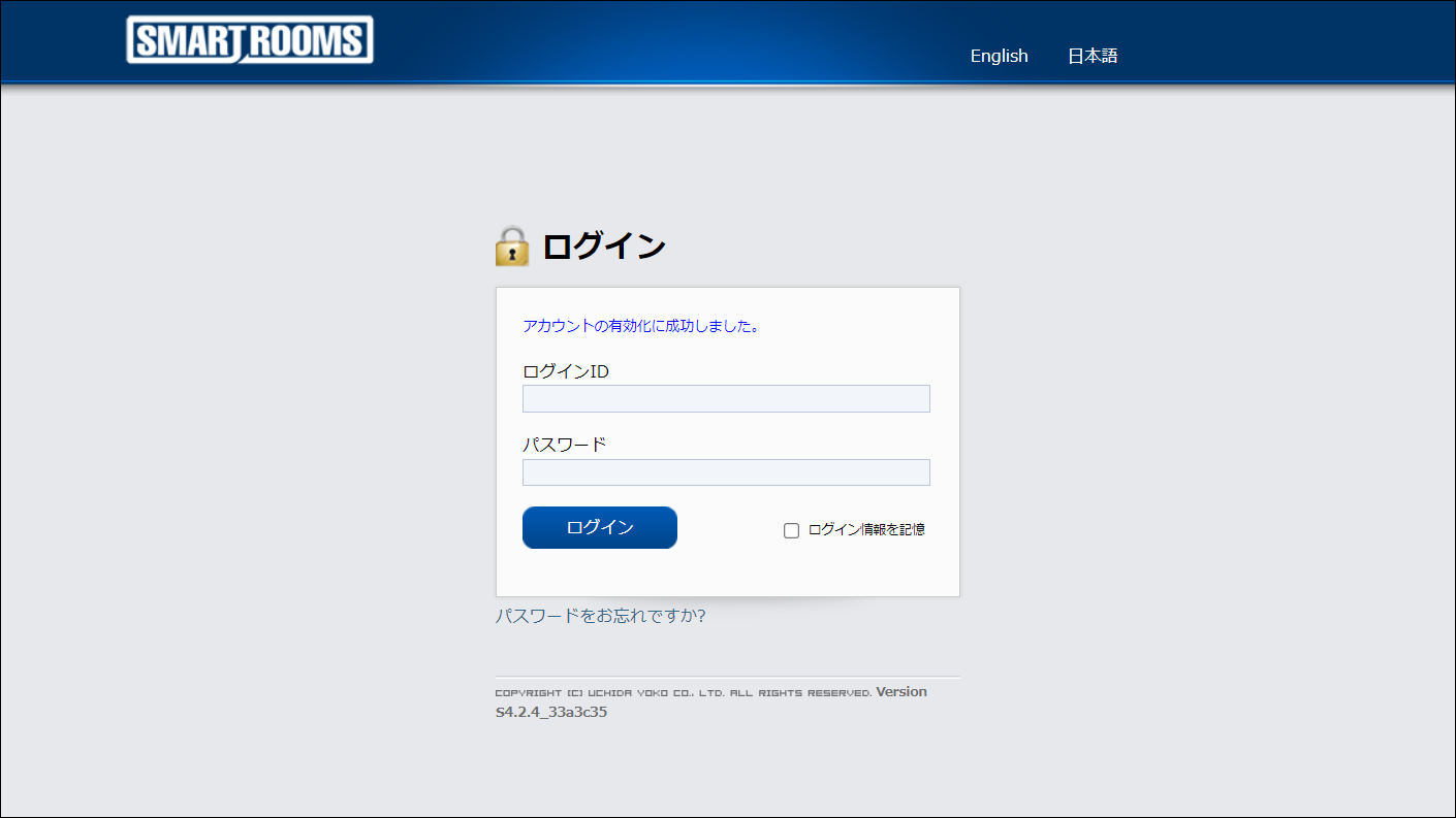 管理者用ウェブサイトのログイン画面に「アカウントの有効化に成功しました。」と表示されるので、「法人管理ユーザーの新規作成通知」に記載されているIDとパスワードでログインします。