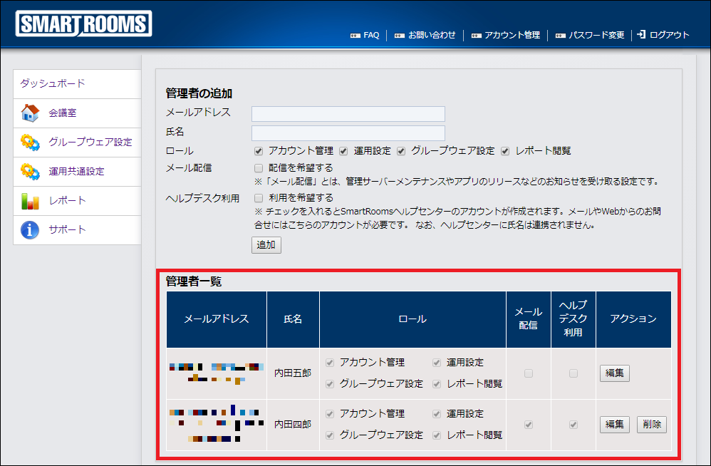 管理者一覧で該当アカウントの[削除]をクリックします。