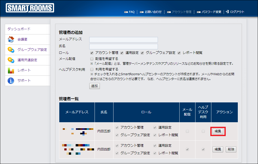 管理者一覧で該当管理者のアクションにある「編集」をクリックします。