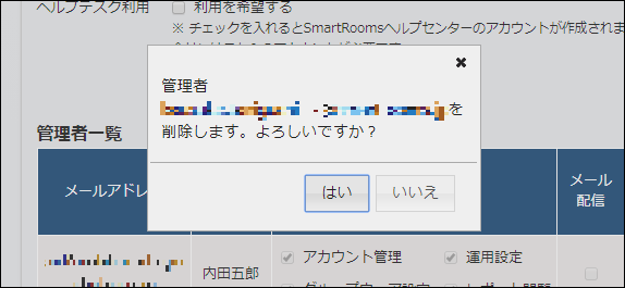 削除された管理者は、管理者用ウェブサイトにログインできなくなります。削除された管理者のメールアドレス宛に、「法人管理ユーザーの削除通知」というメールが配信されます。→ ヘルプデスク利用にチェックをつけている場合は「SmartRoomsヘルプセンターの利用停止通知」というメールも配信されます。
