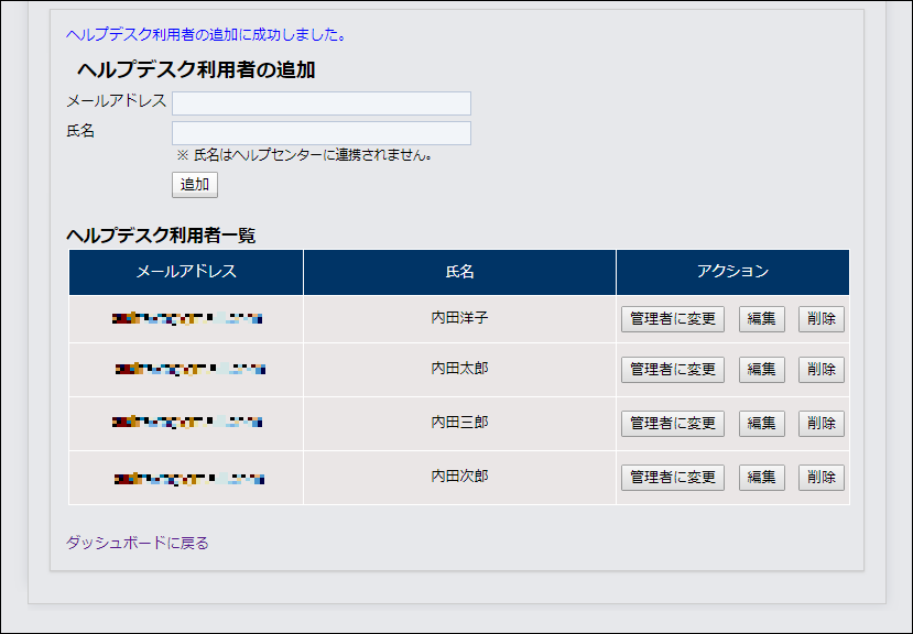 「ヘルプデスク利用者の追加に成功しました。」というメッセージが表示され一覧に追加されます。