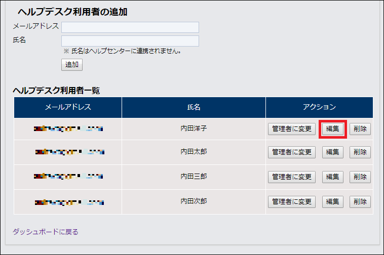 ヘルプデスク利用者一覧で該当ヘルプデスク利用者のアクションにある「編集」をクリックします。