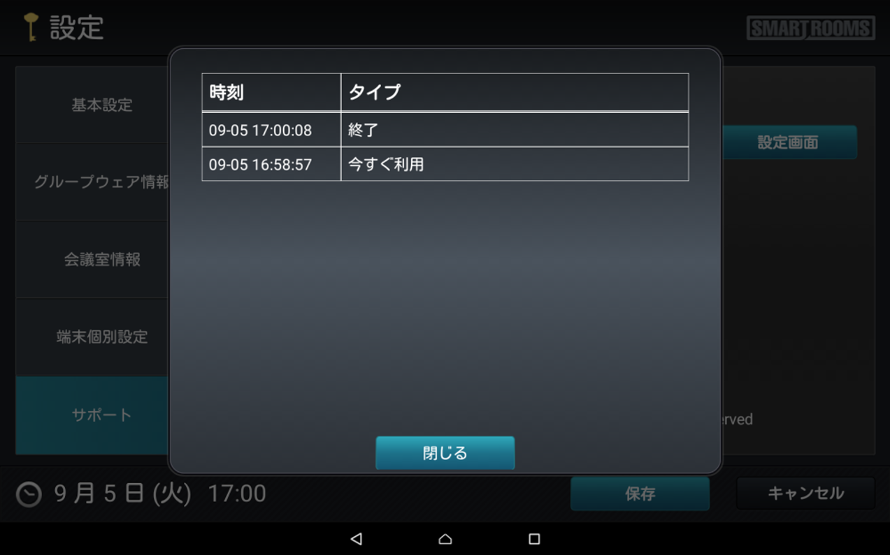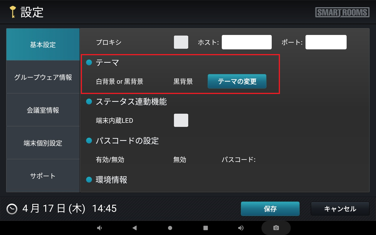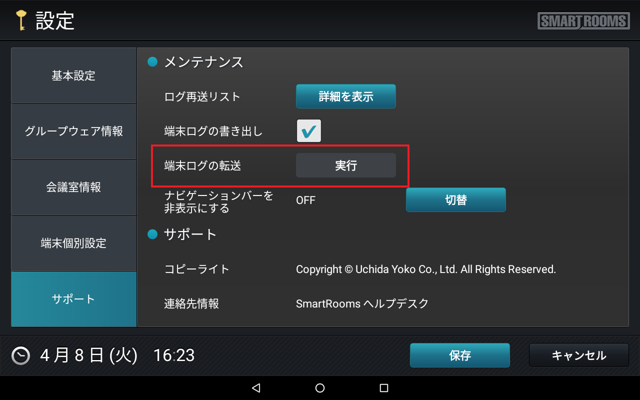 設定された内容は、30分に1回の定期アクセスで端末に取得されて反映されます。即時に反映させる場合は、SmartRoomsアプリの設定画面で[設定の取得]をタップして設定を保存してください。設定画面の表示は「 設定画面への移動 」を参照してください。