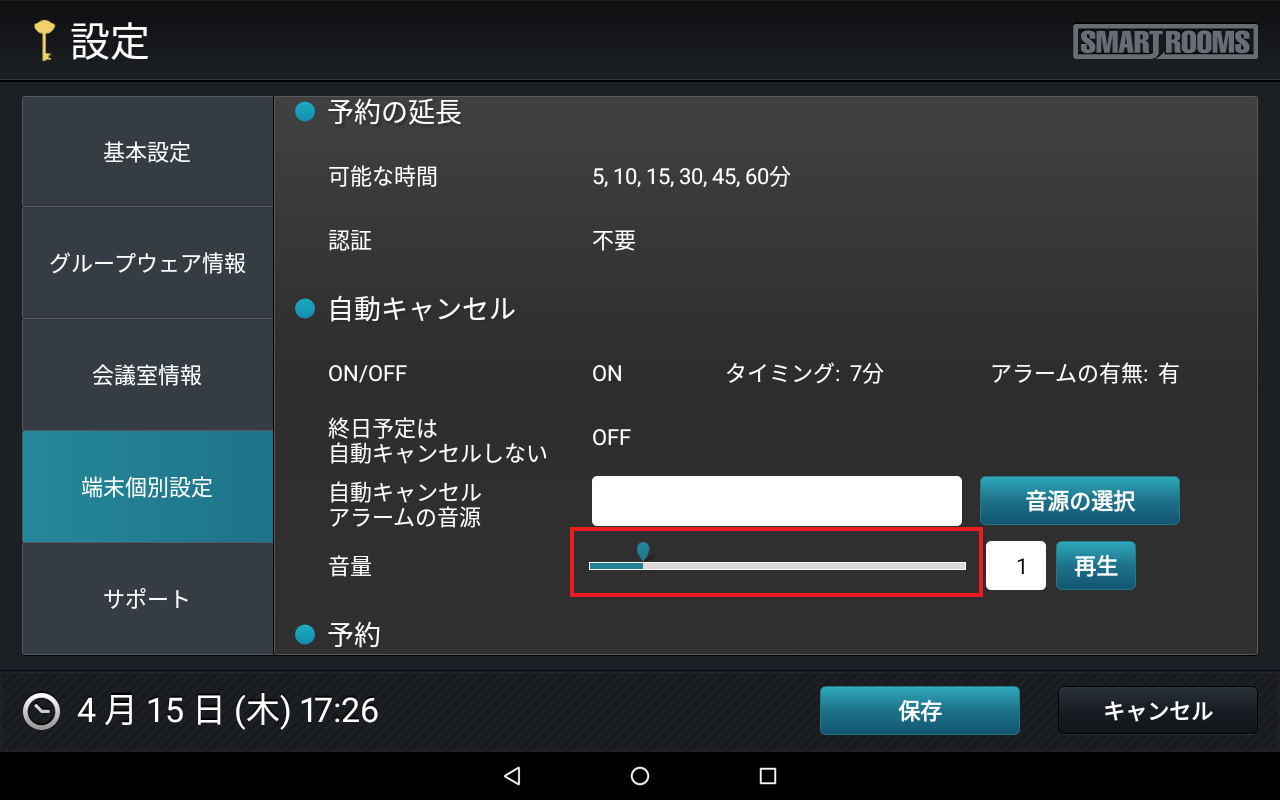 - 自動キャンセルの設定時刻前に端末でアラーム音を鳴らせます。アラームは時間設定ができます。会議室一覧にR-GOを利用する端末が含まれる場合のみに項目が表示されます。