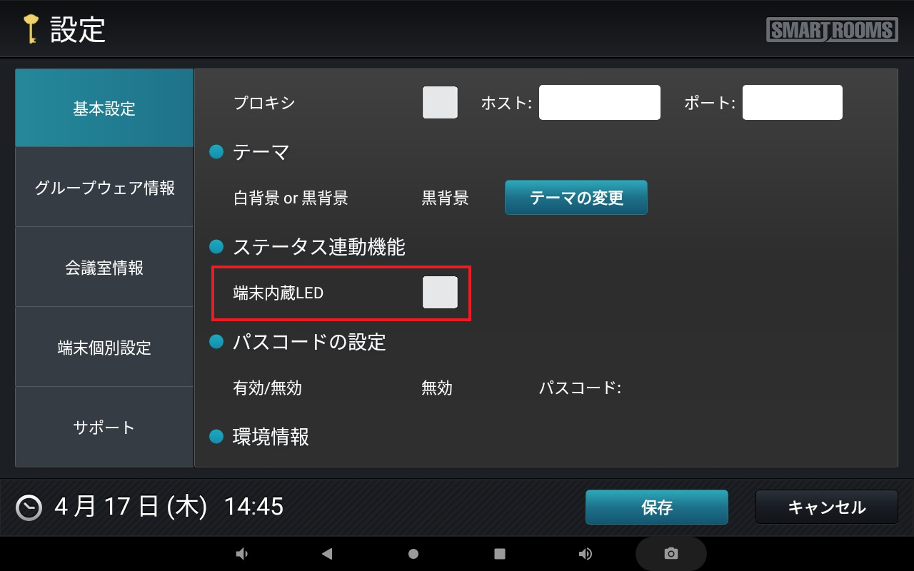 設定された内容は、30分に1回の定期アクセスで端末に取得されて反映されます。即時に反映させる場合は、SmartRoomsアプリの設定画面で[設定の取得]をタップして設定を保存してください。設定画面の表示は「 設定画面への移動 」を参照してください。重要