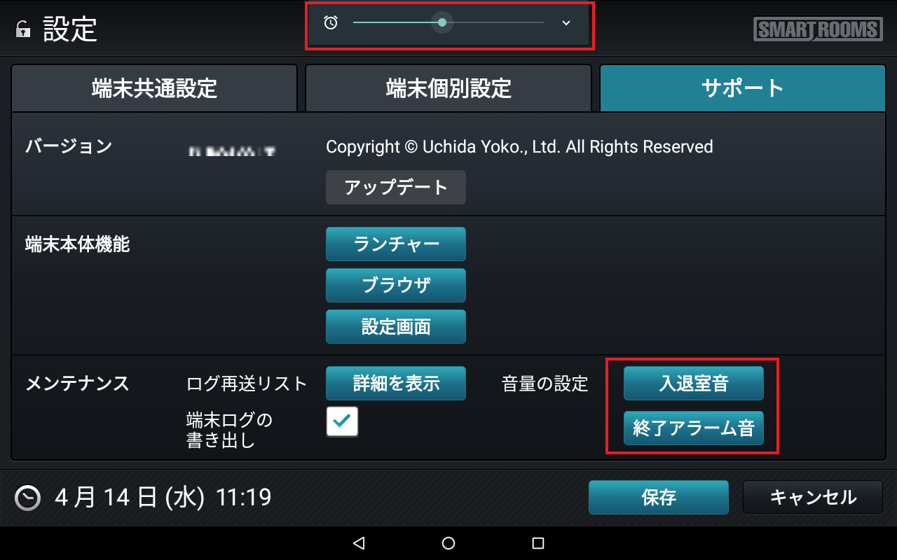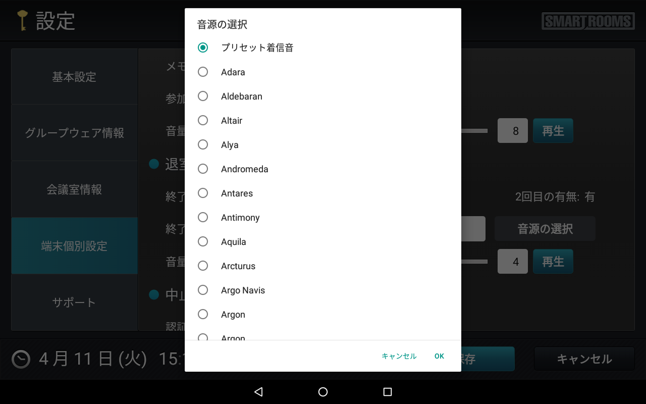 - 自動キャンセルの設定時刻前に端末でアラーム音を鳴らせます。アラームは時間設定ができます。会議室一覧にR-GAを利用する端末が含まれる場合のみに項目が表示されます。