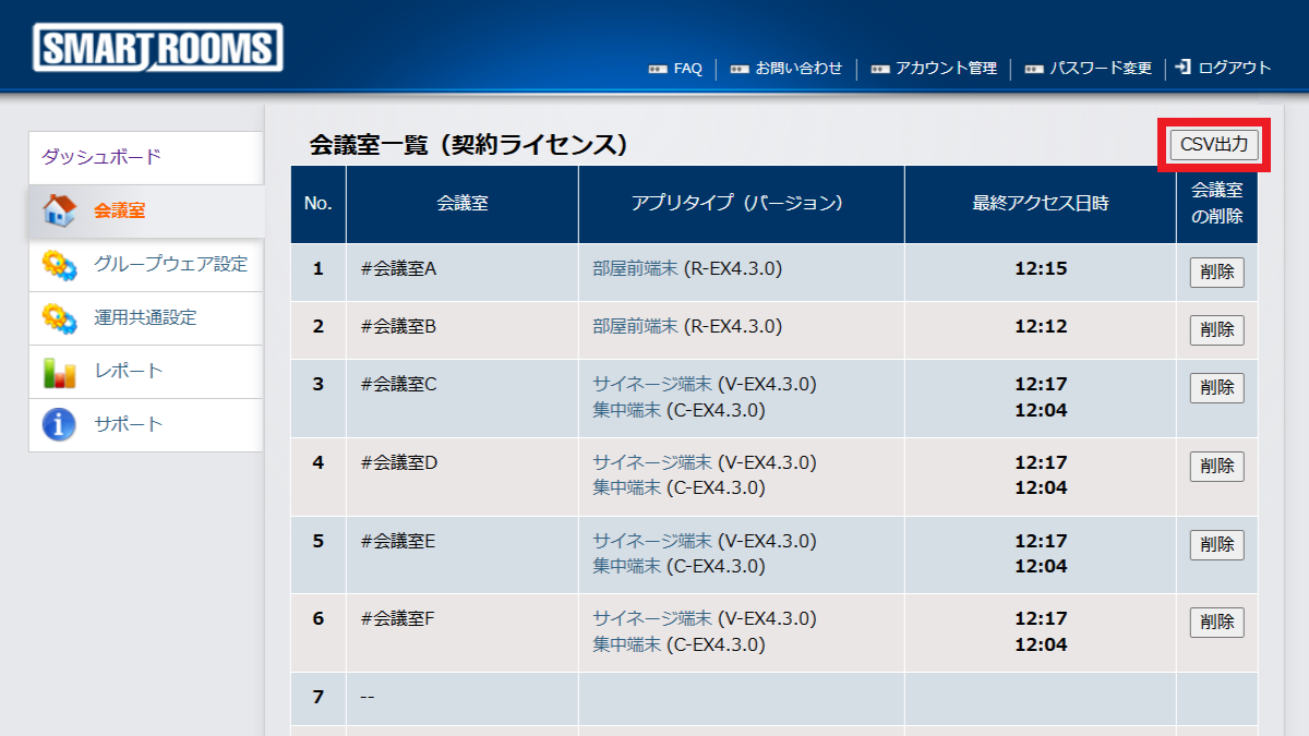 会議室一覧の右上にある[CSV出力]をクリックし、ファイルを任意のフォルダに保存します。