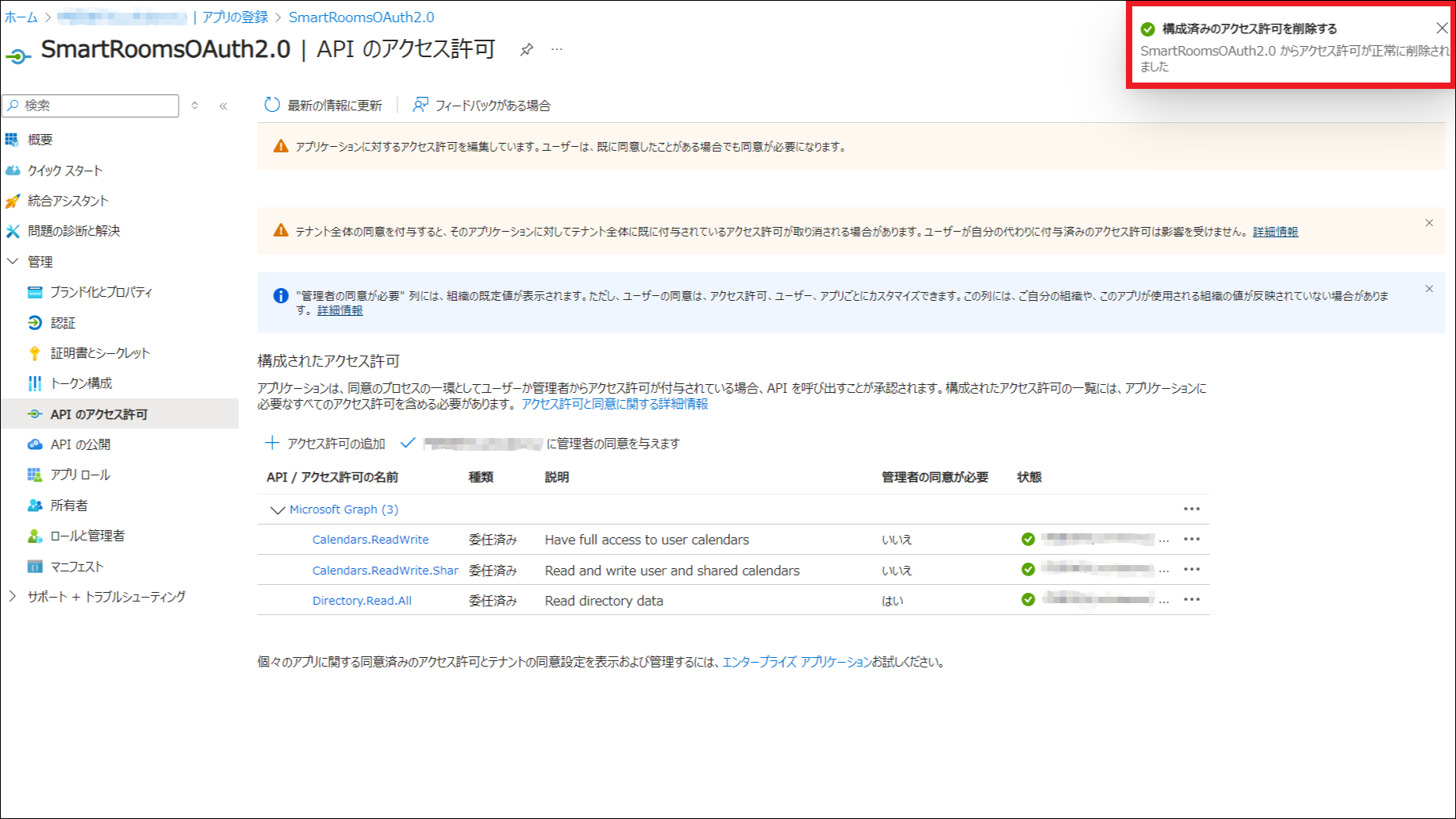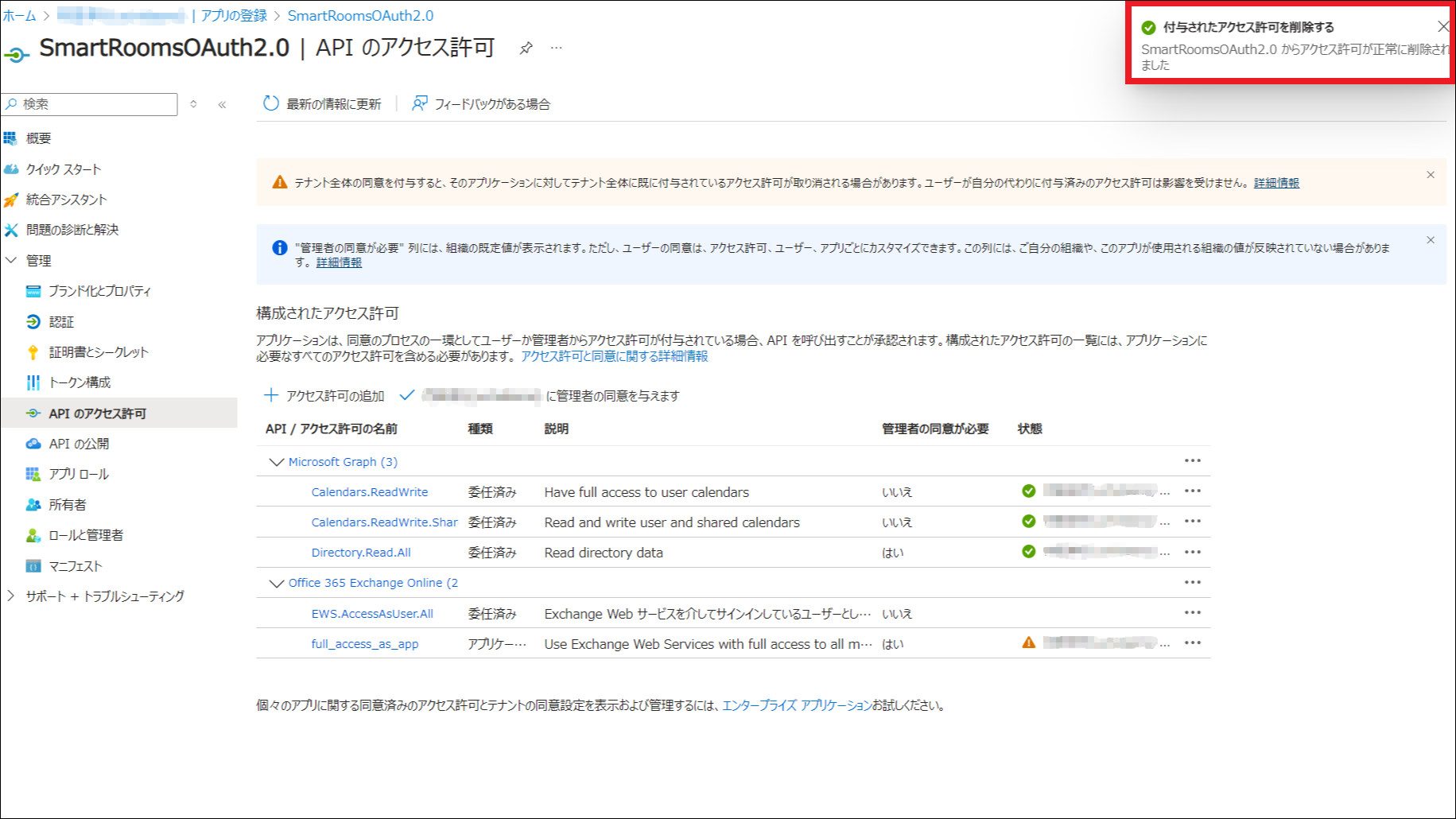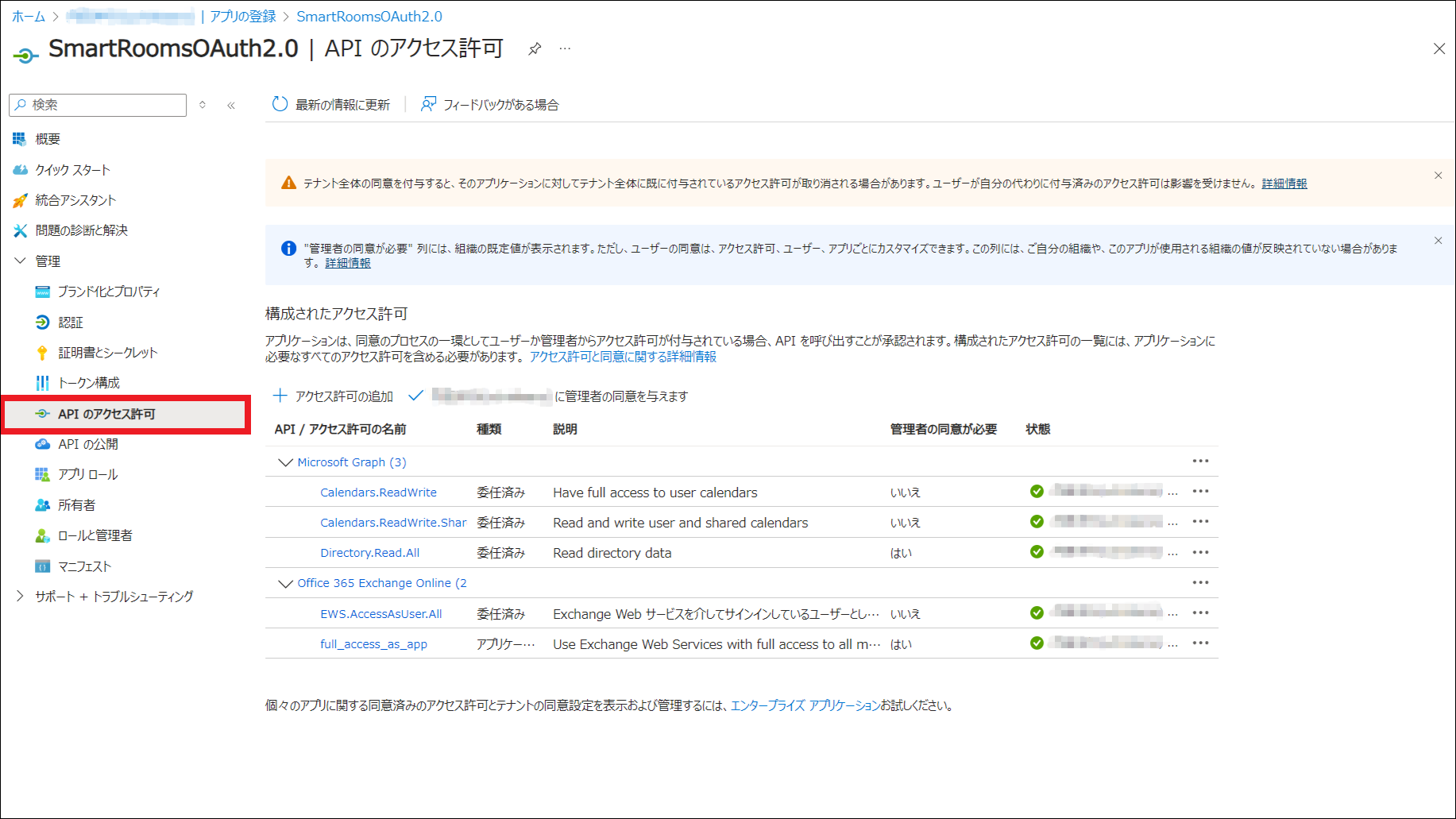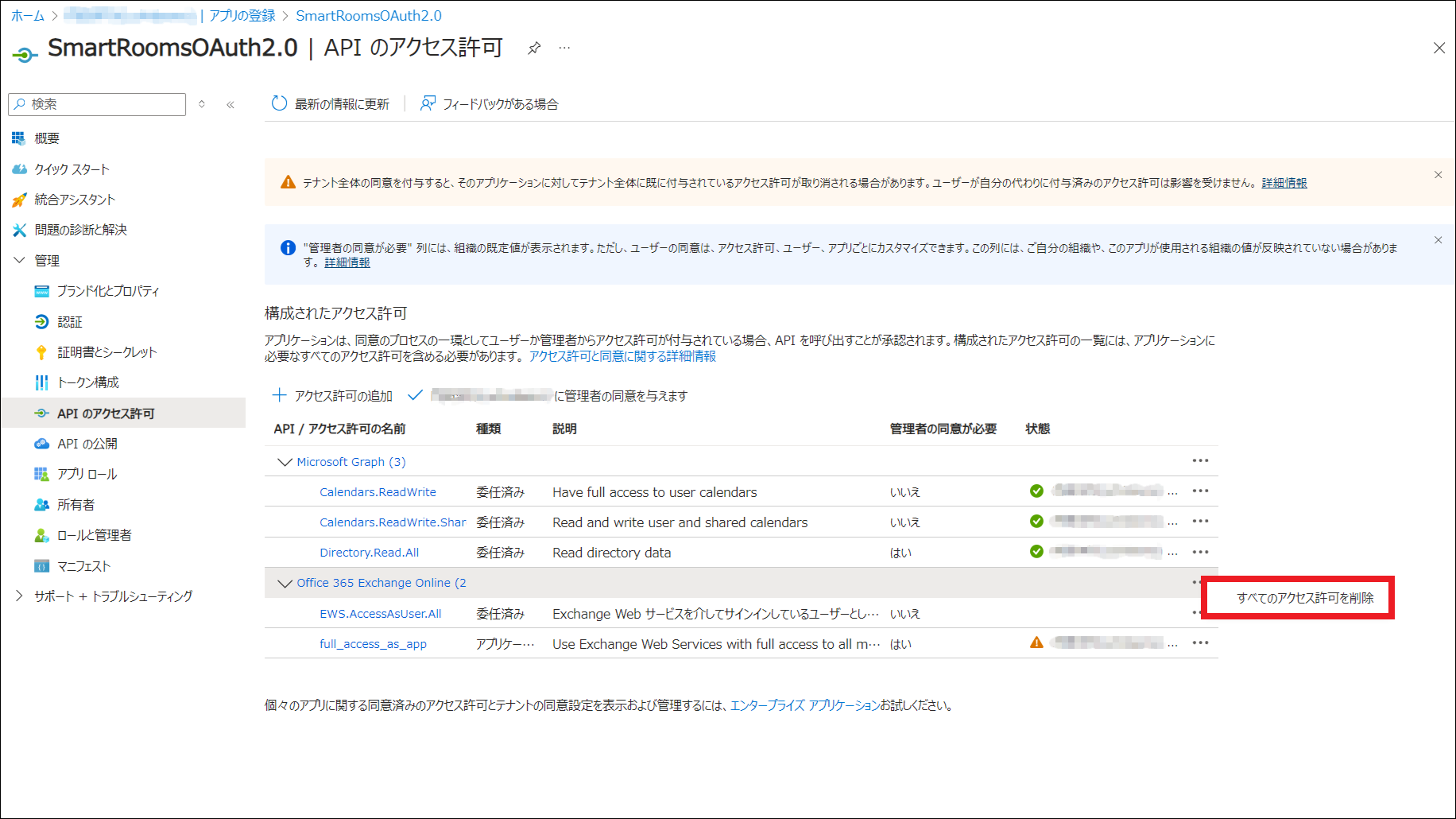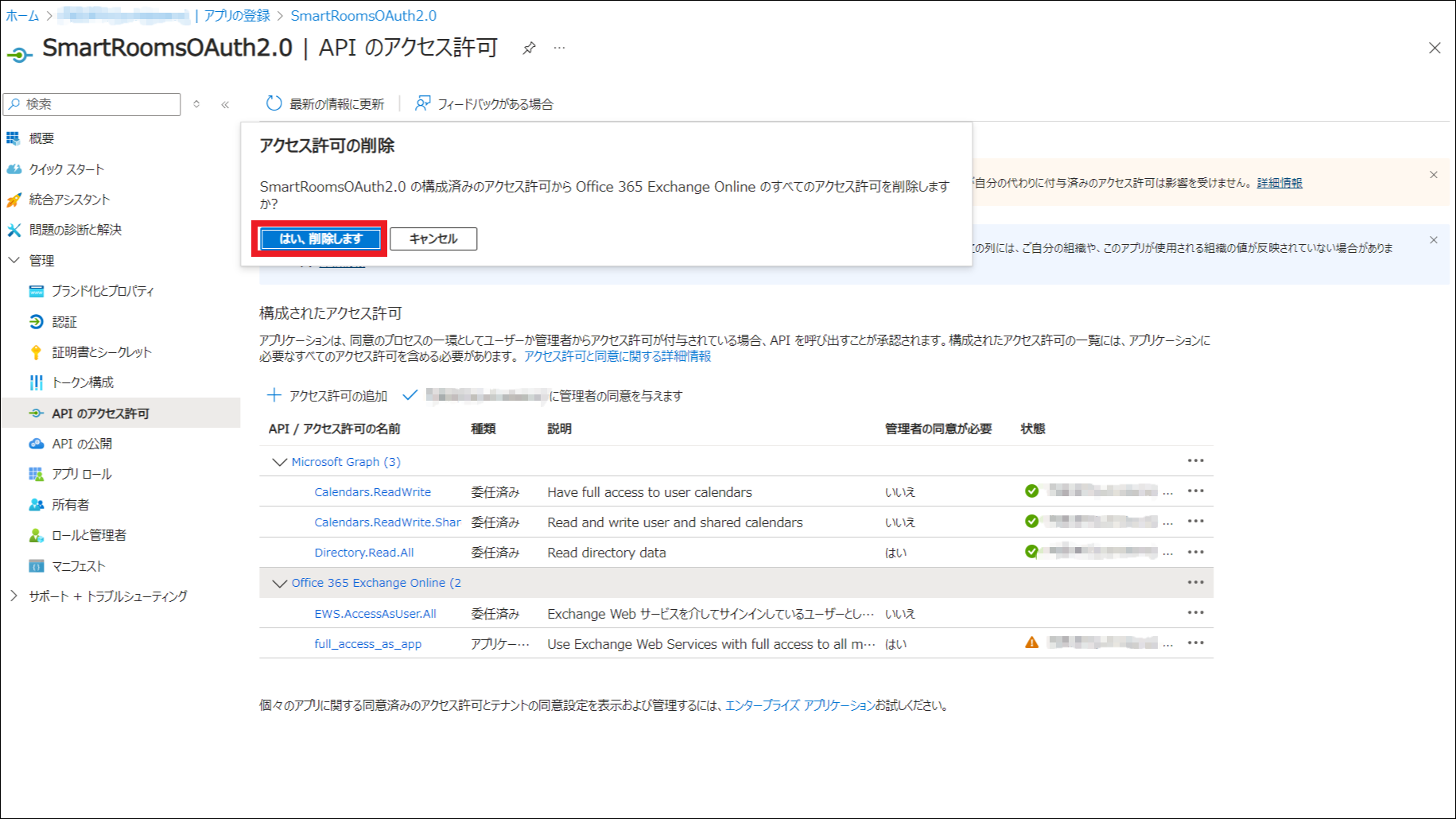 EWSからGraph APIへの切り替え完了後、SmartRoomsと連携するためにEntra IDに登録したアプリケーションから、EWSを使用するためのアクセス許可を削除します。