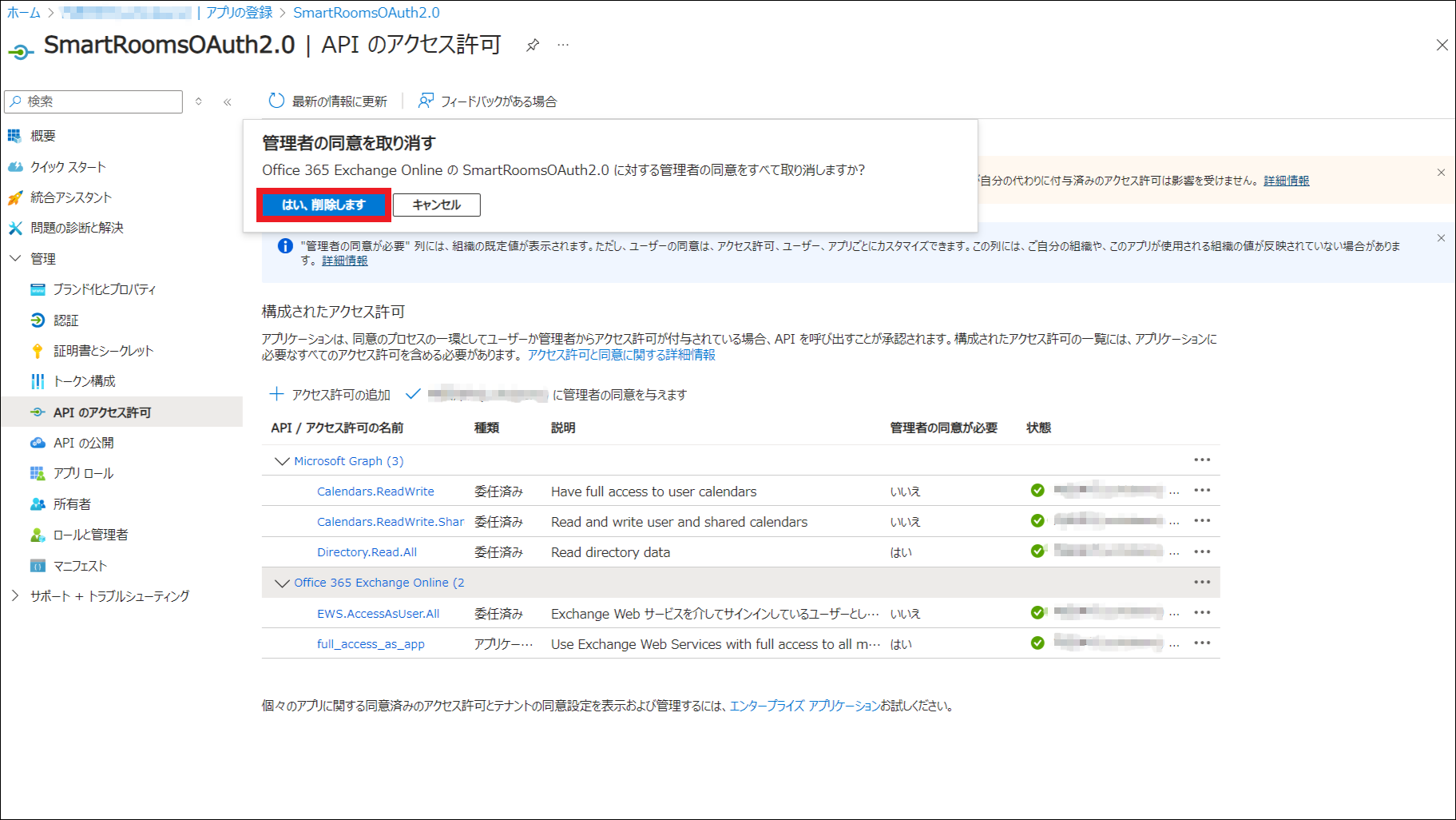 「管理者の同意を取り消す」の[はい、削除します]をクリックします。