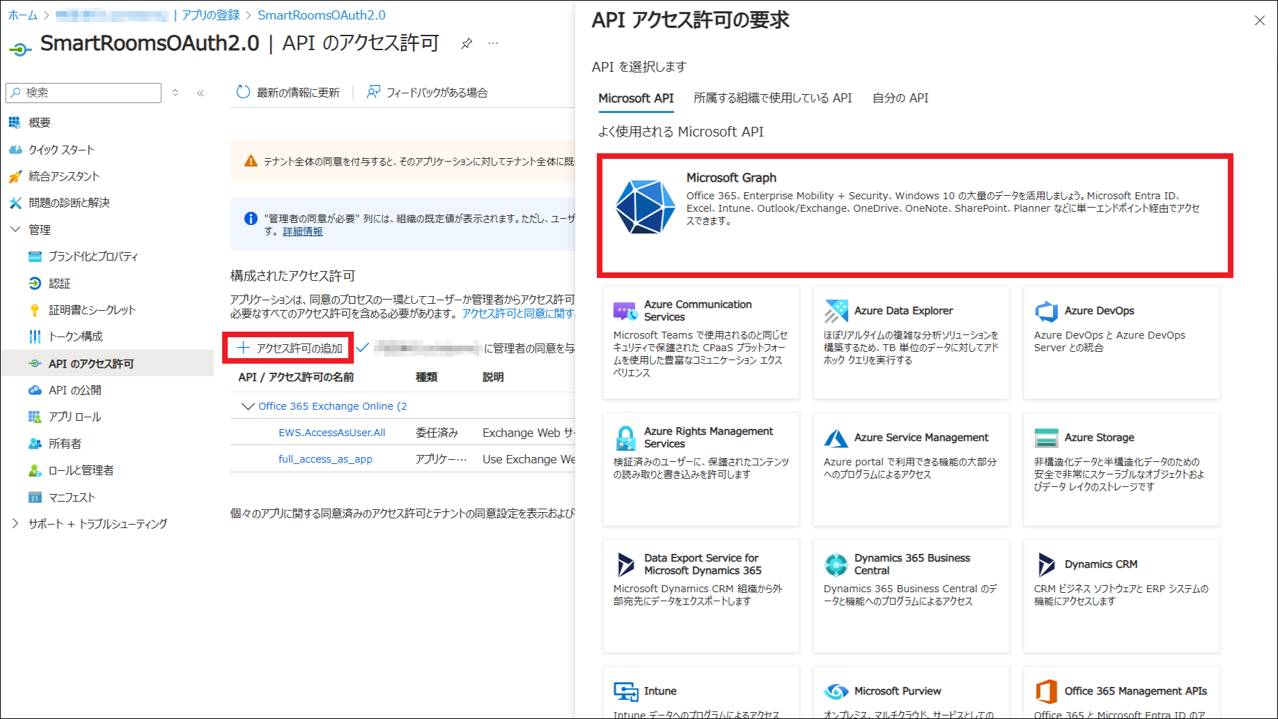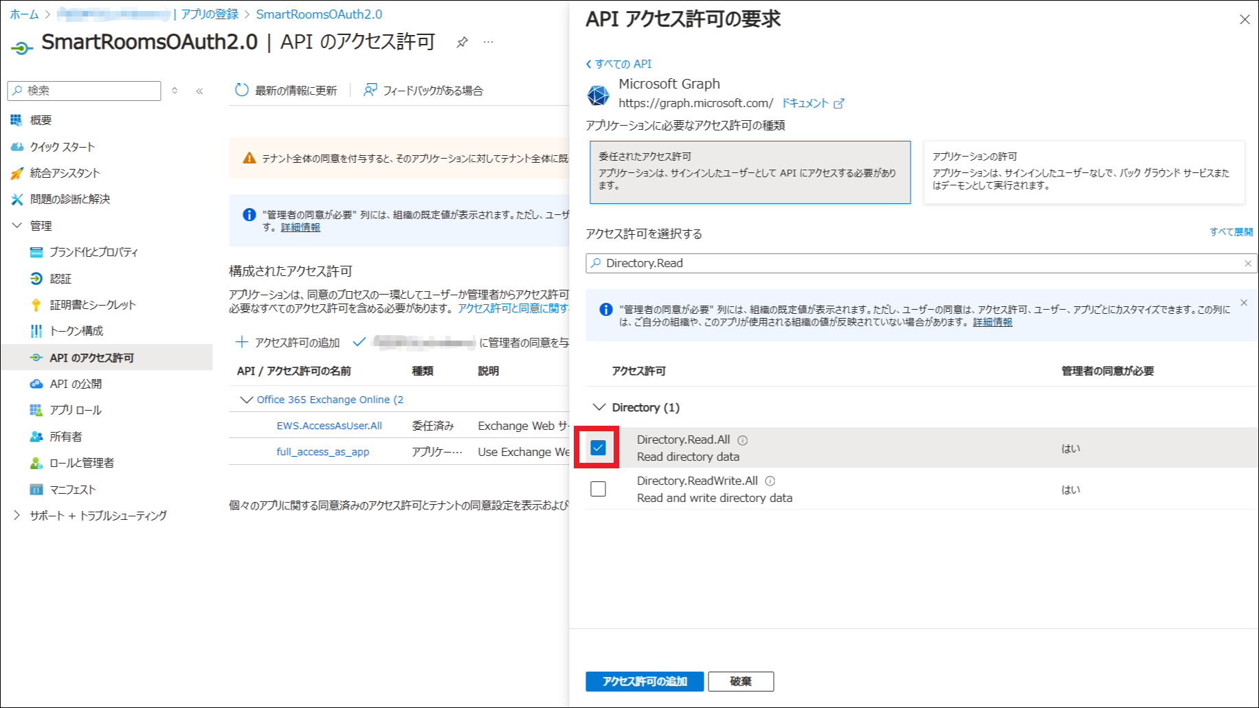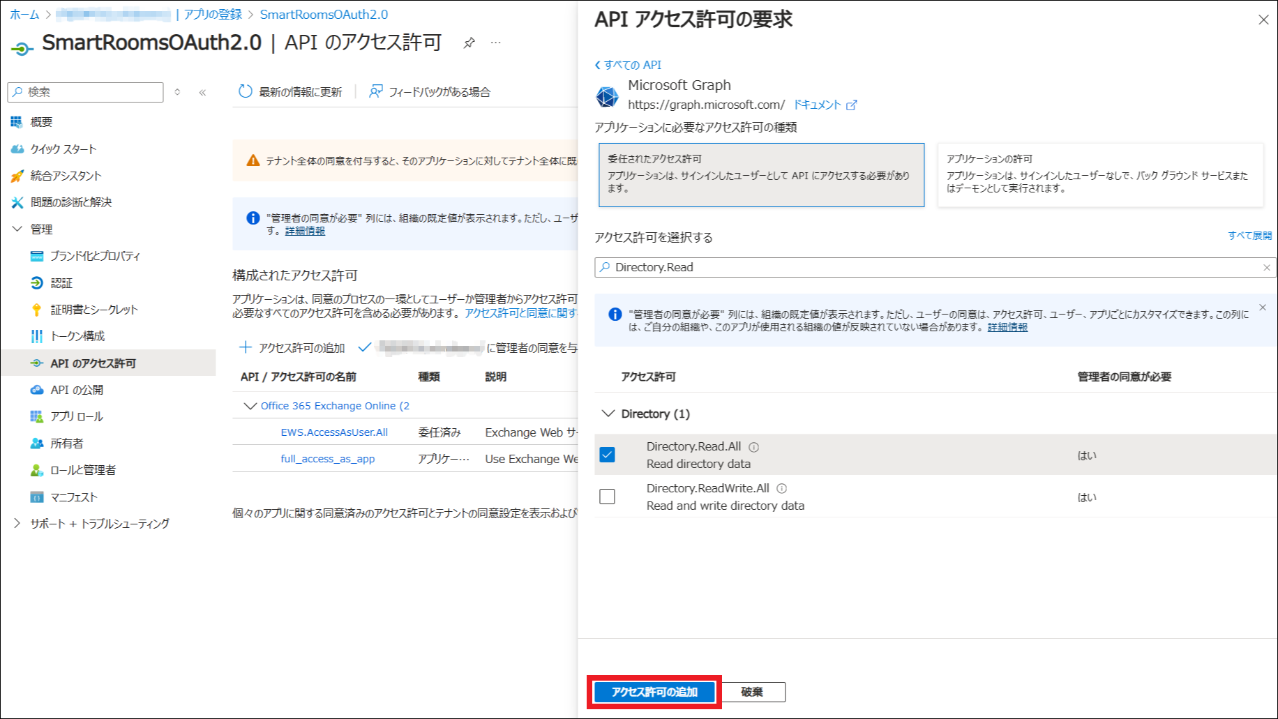 SmartRoomsと連携するためにEntra IDに登録したアプリケーションに対して、Graph APIを使用するためのアクセス許可を追加します。