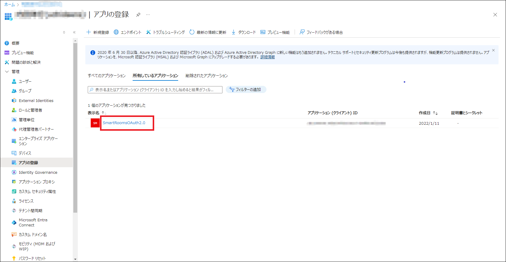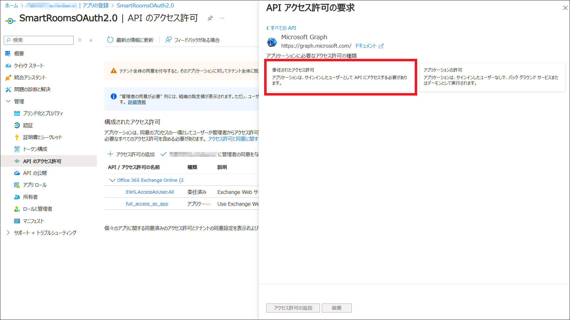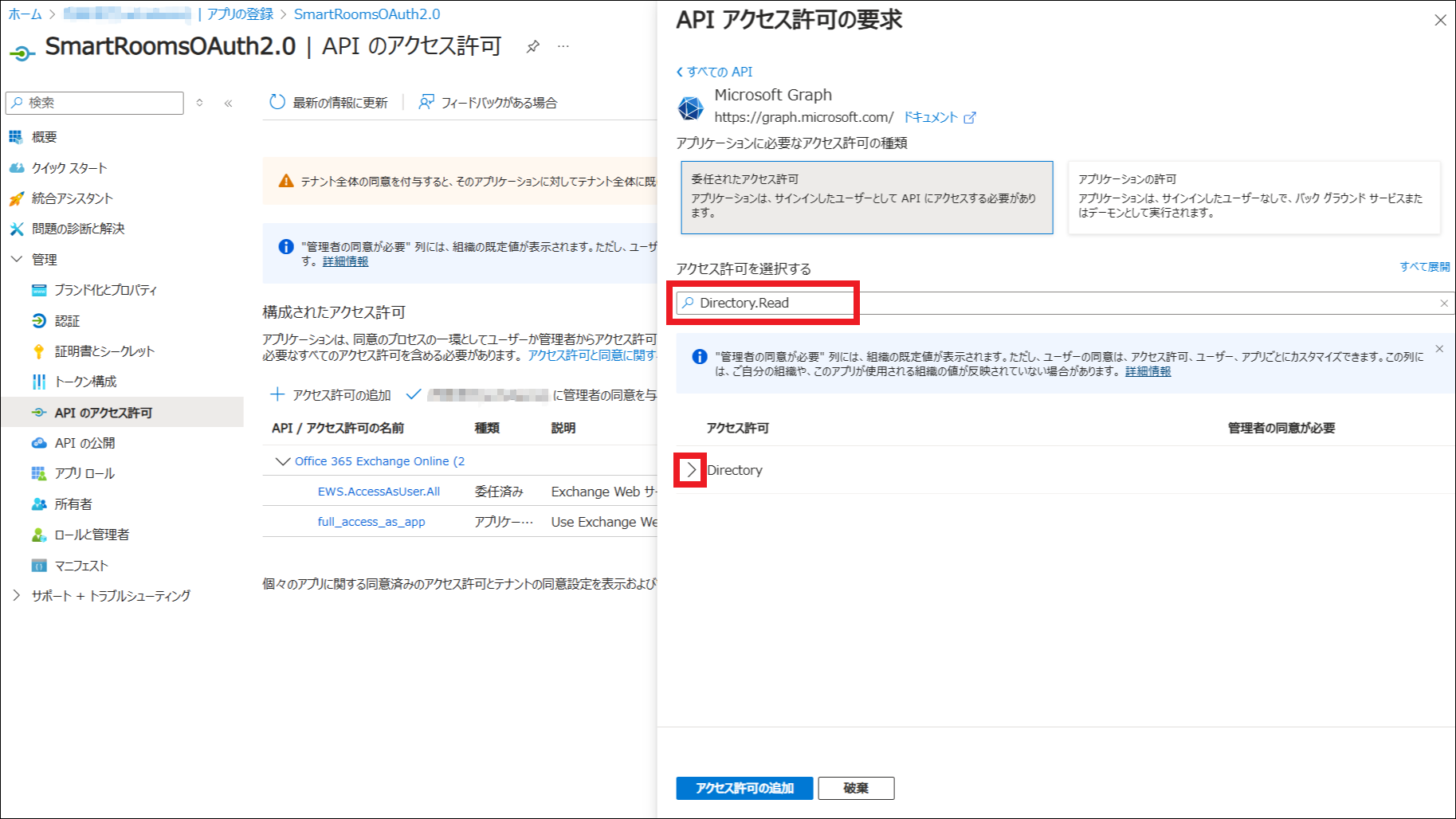 SmartRoomsと連携するためにEntra IDに登録したアプリケーションに対して、Graph APIを使用するためのアクセス許可を追加します。