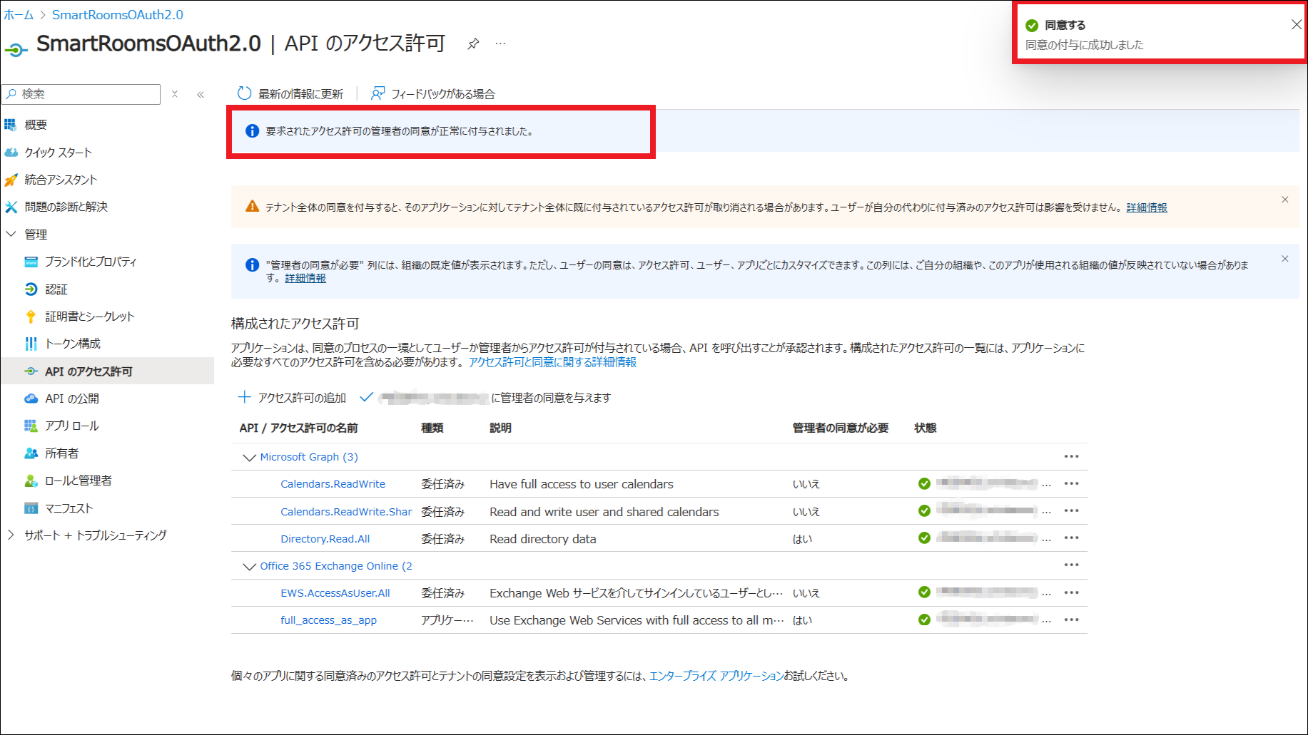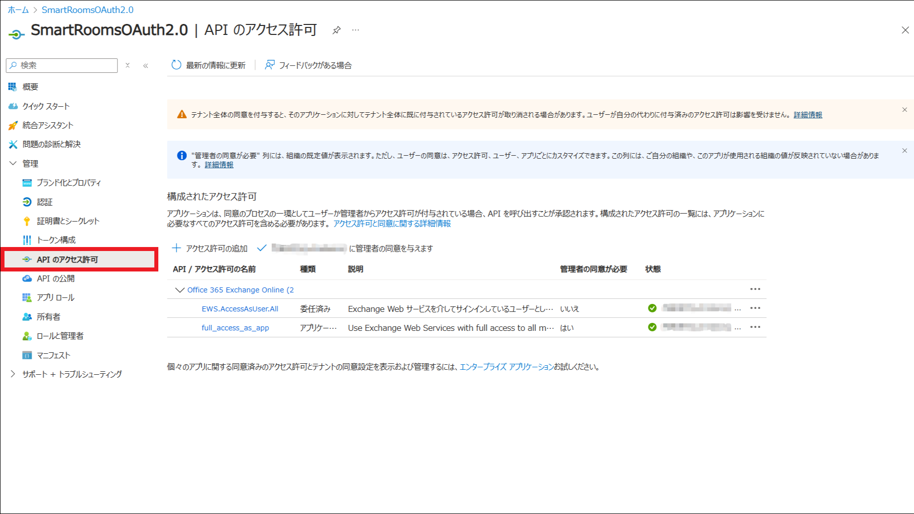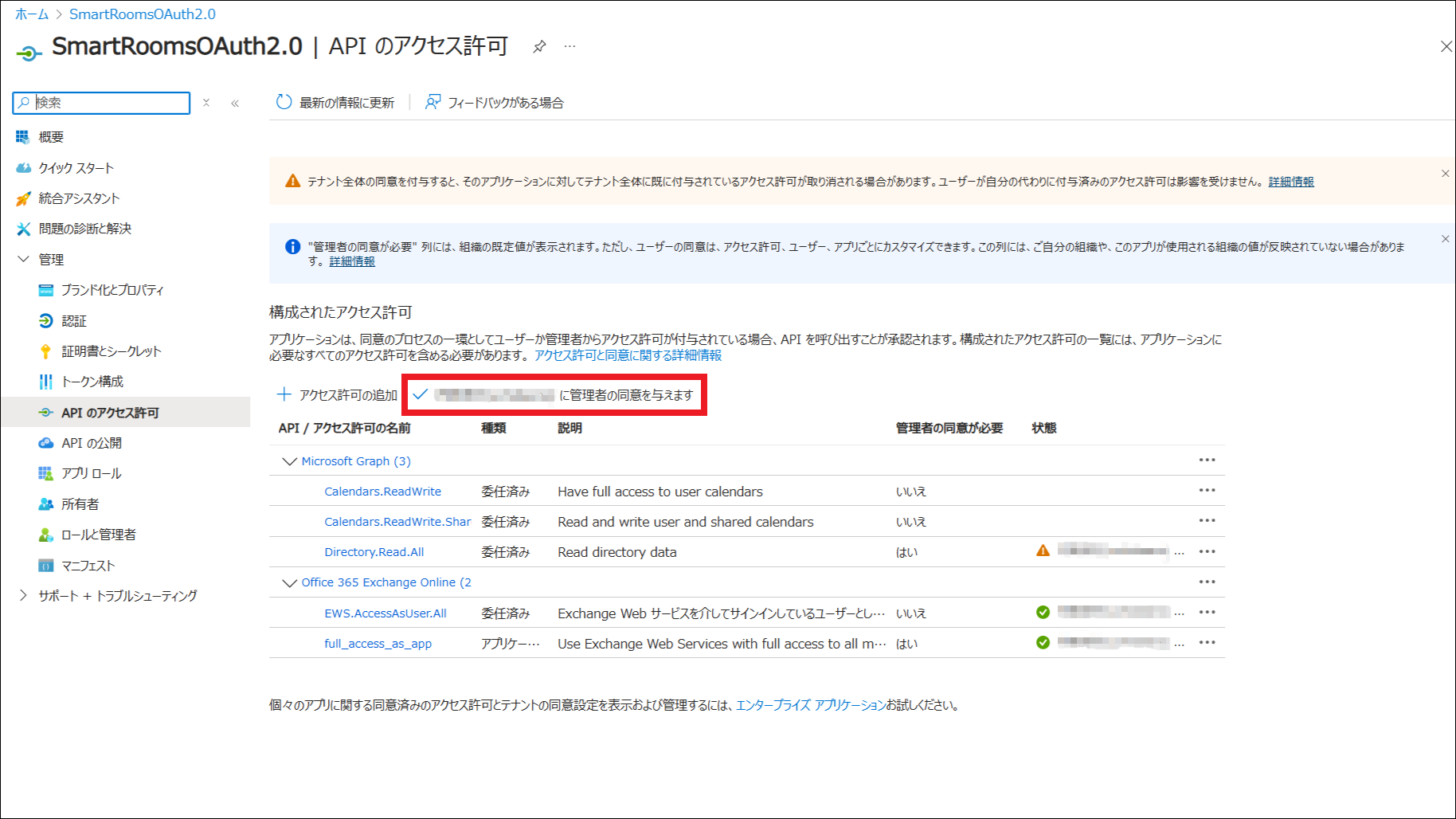 [アクセス許可の追加]の右側の[{組織名} に管理者の同意を与えます]をクリックします。