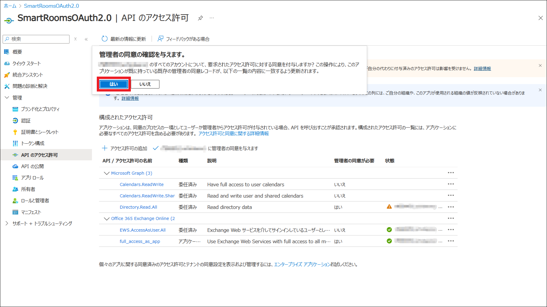 「管理者の同意の確認を与えます」のダイアログの[はい]をクリックします。