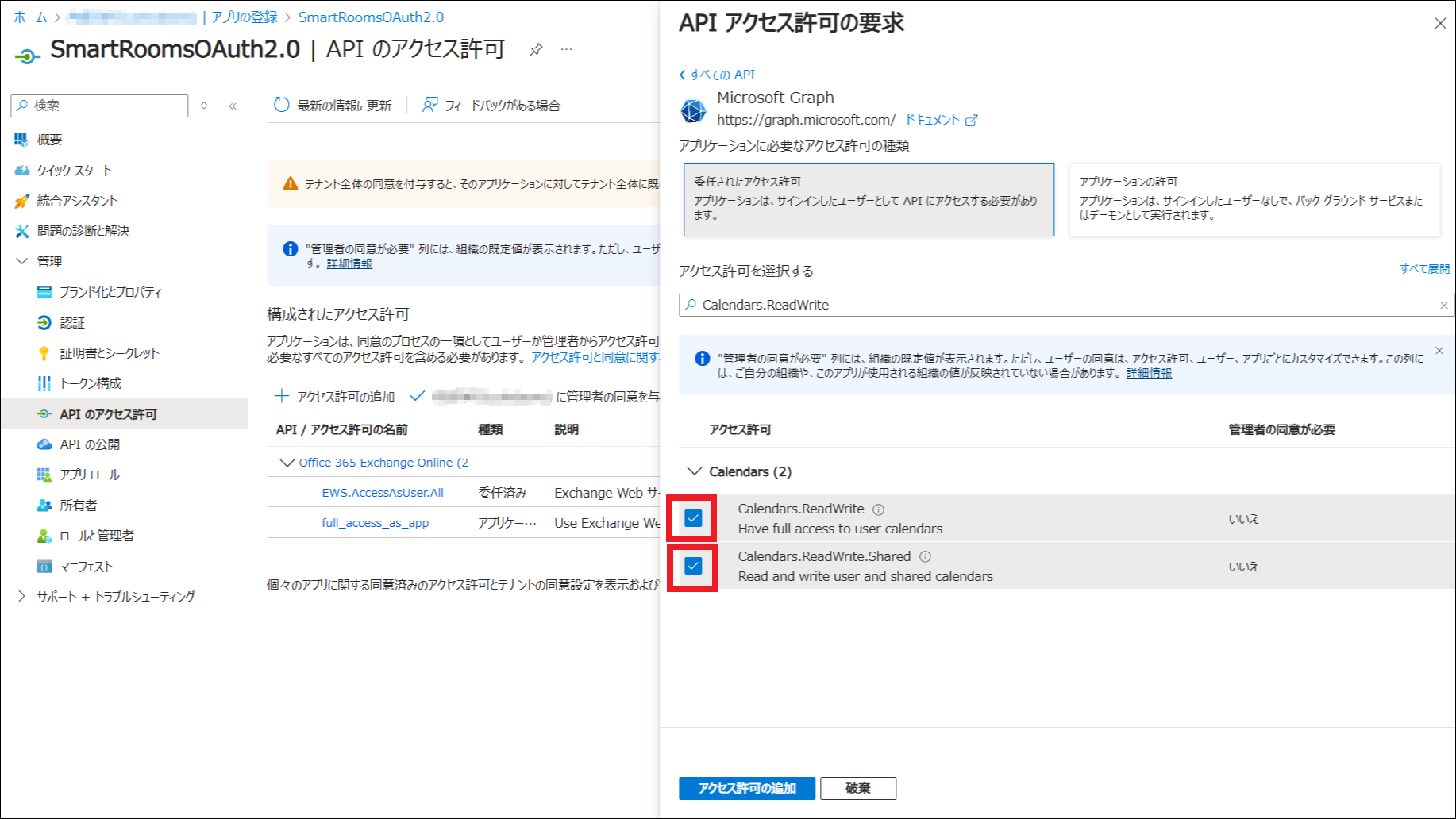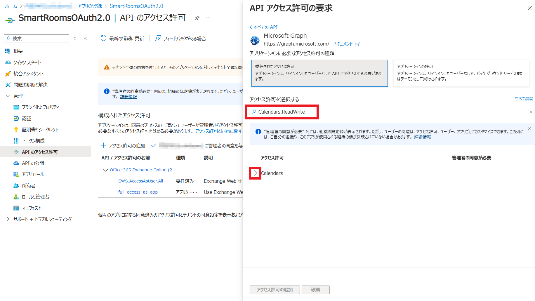 b). アクセス許可名が展開されるので、「Calendars.ReadWrite」「Calendars.ReadWrite.Shared」にチェックを入れます。