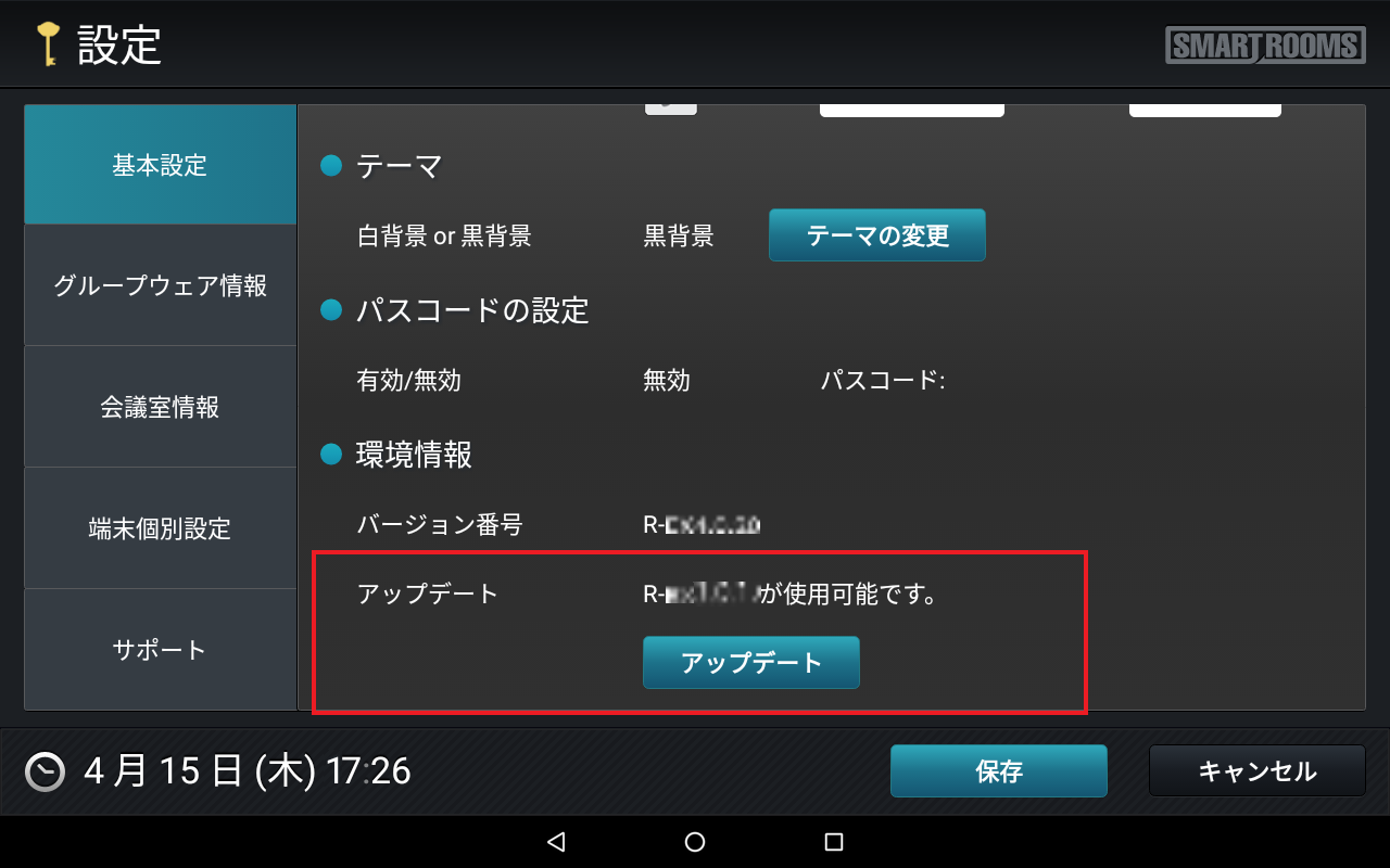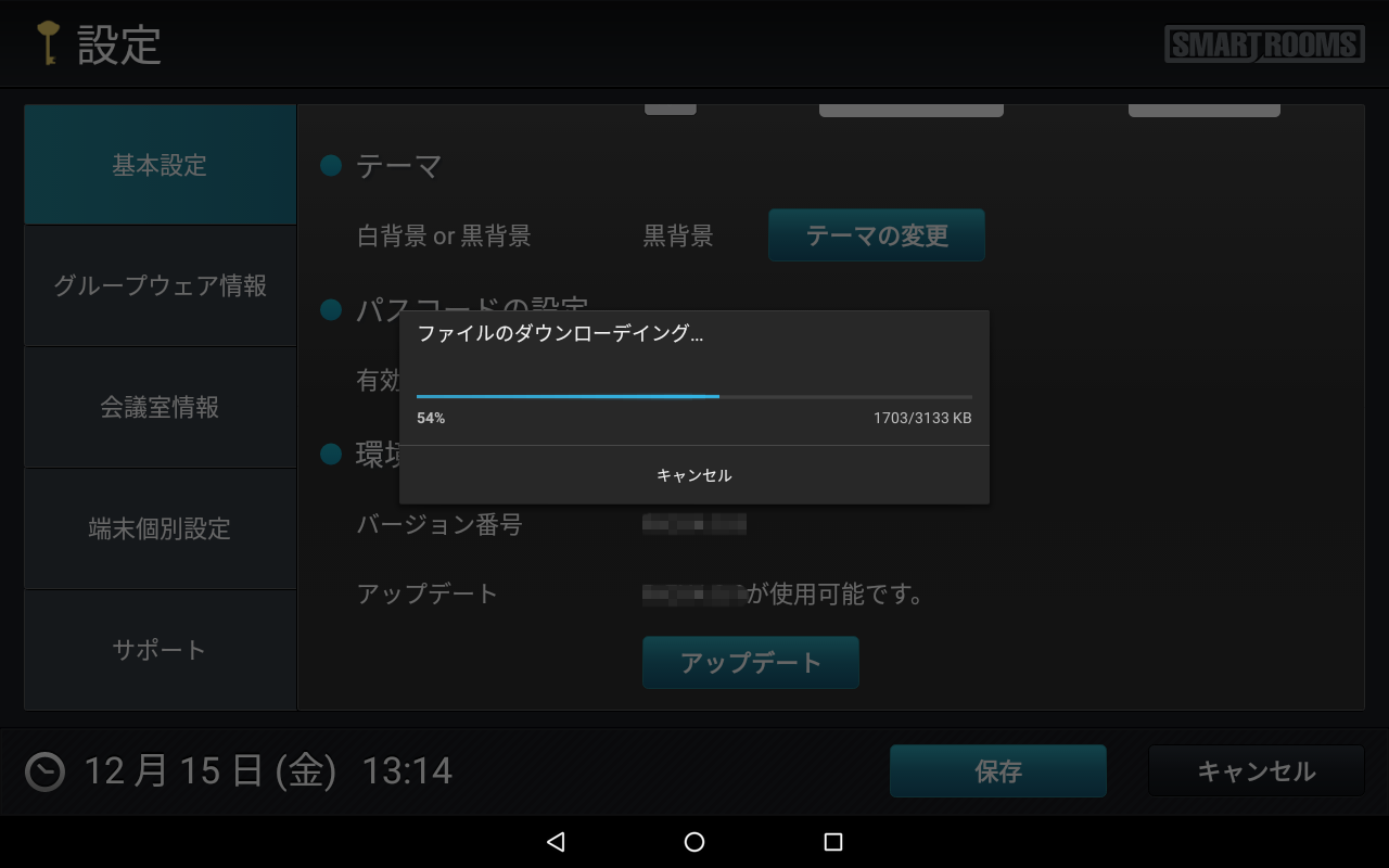 SmartRoomsアプリを初期化した場合、契約IDとシークレットの入力、会議室の設定、および入退室音・各種アラーム音などの「端末個別設定」の再設定が必要です。